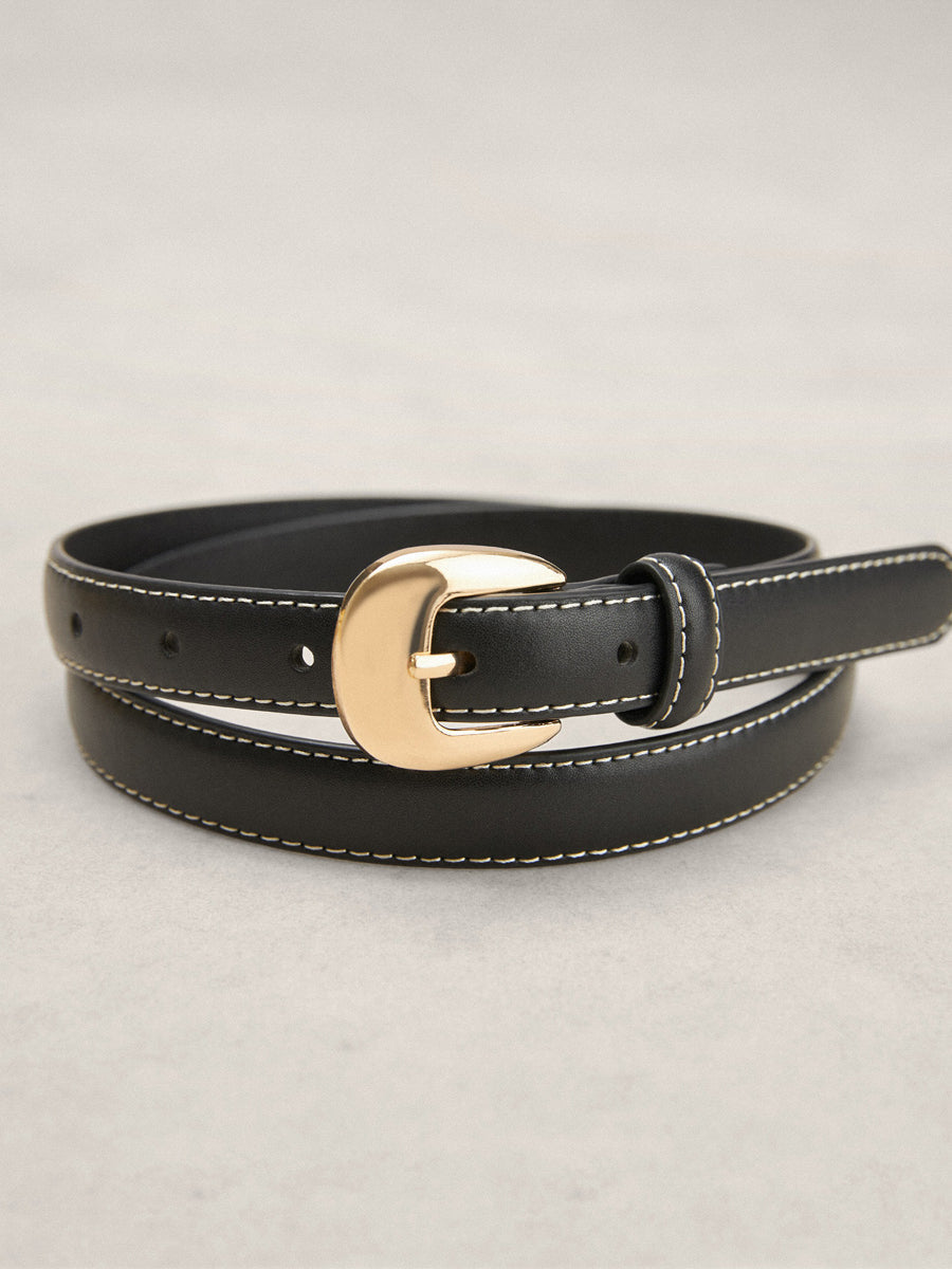 Cinturón de piel de 2 cm de ancho con hebilla metálica. Pespuntes a contraste.