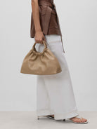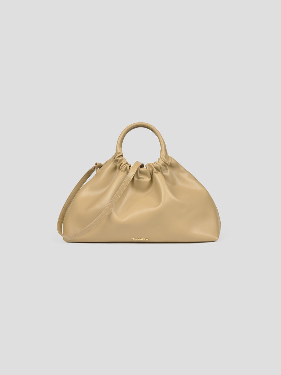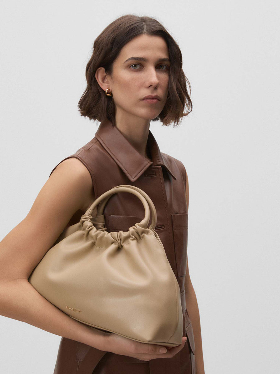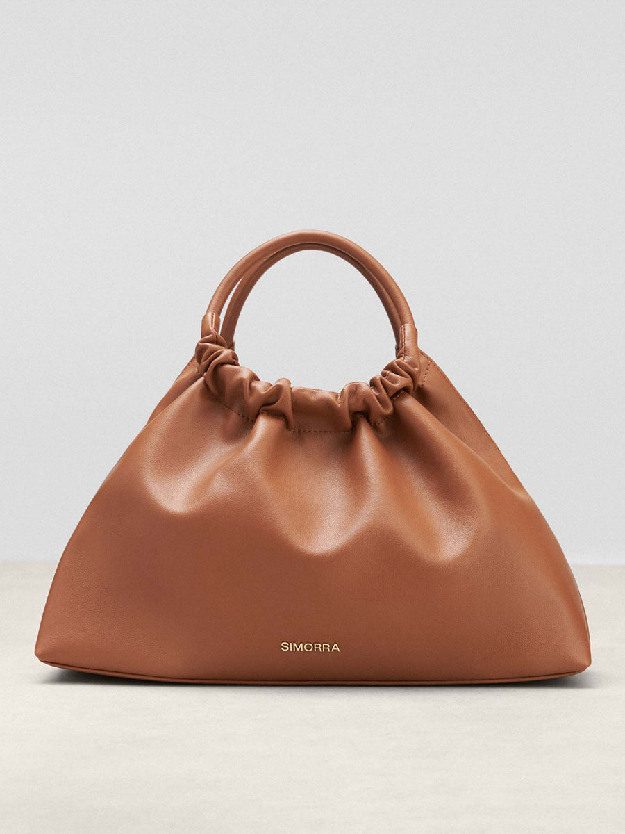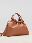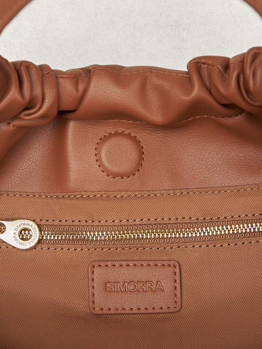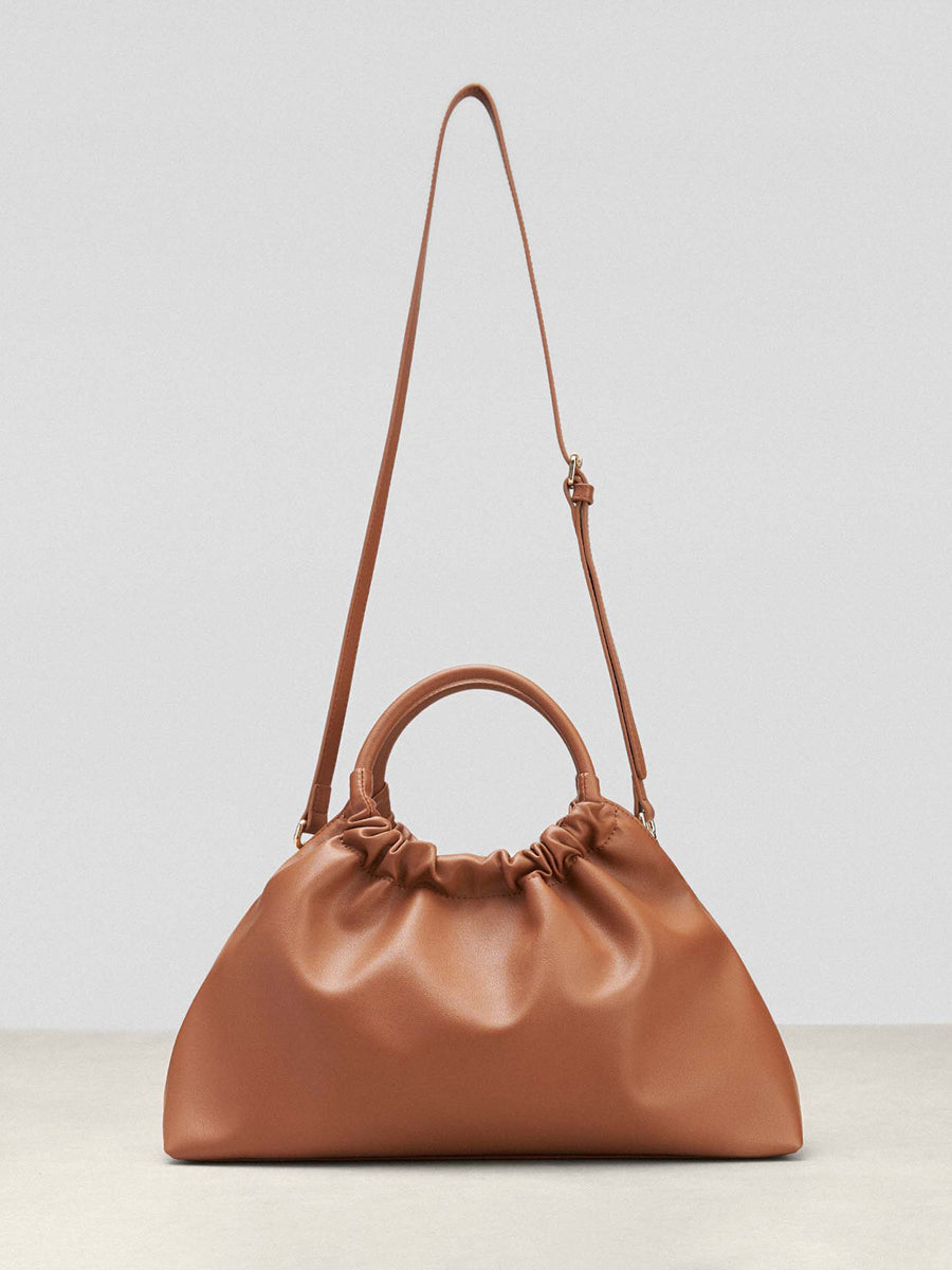 Bolso de piel con asa de mano y asa de hombro extraíble. Fruncido por la parte superior. Forro con bolsillo interno.Medidas: Alto: 22 cm, Ancho:39 cm, Fondo: 12 cm