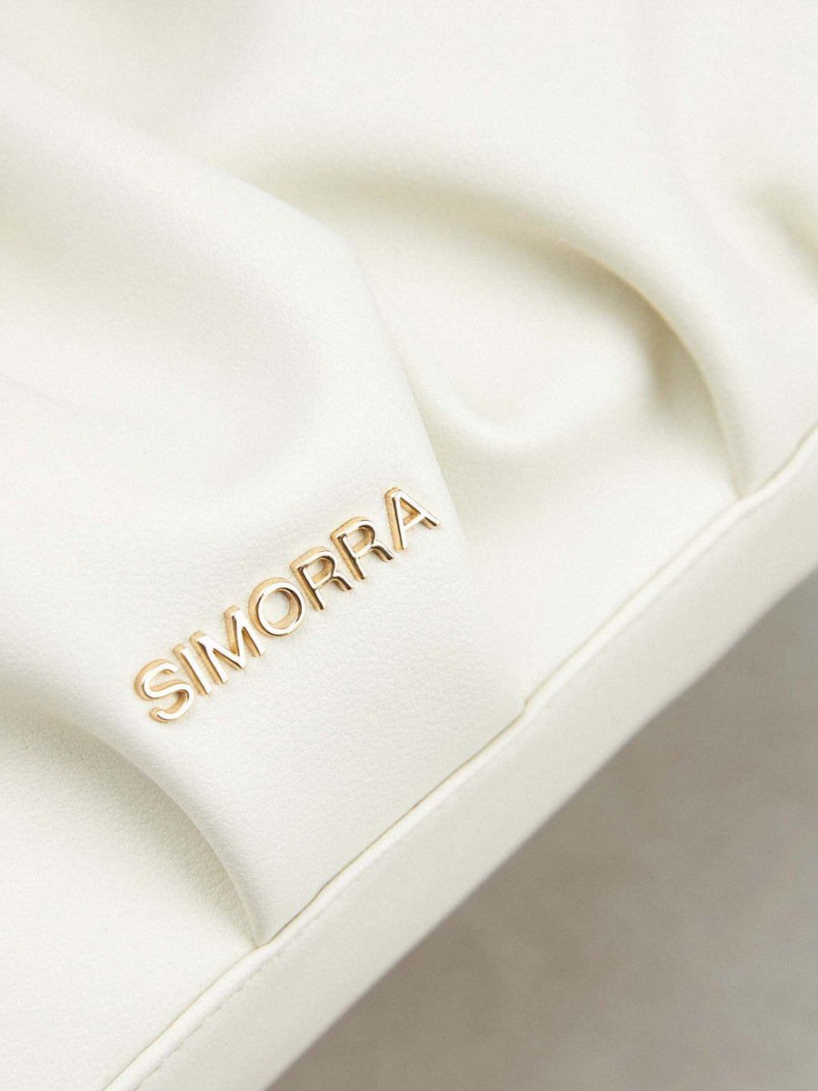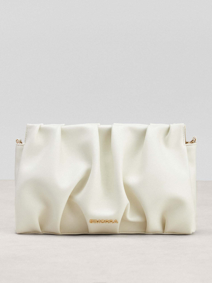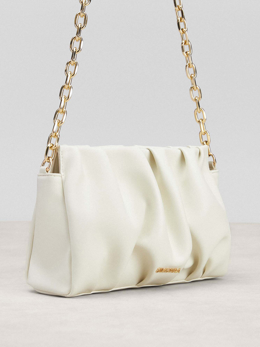 Bolso de piel con pliegues de efecto arrugado. Asa de cadenas extraíble. Forro con bolsillo interno. Alto: 18 cm, Ancho: 27 cm, Fondo: 7 cm