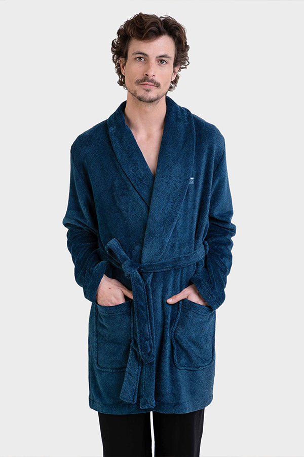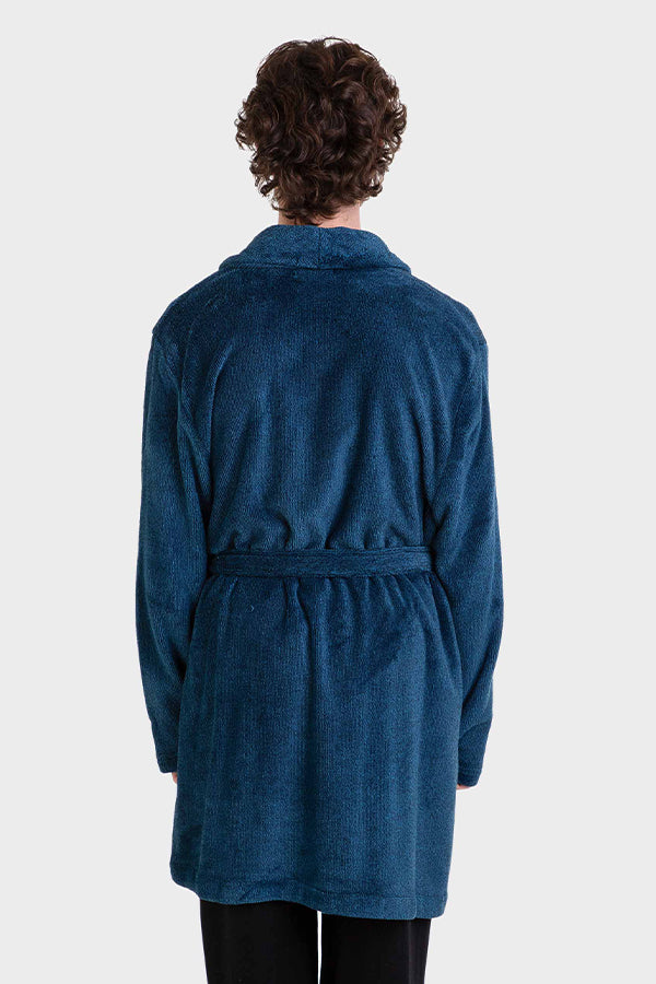 Bata corta en tejido tipo polar lisa y cruzada con cuello smoking, cinturón y dos bolsillos.