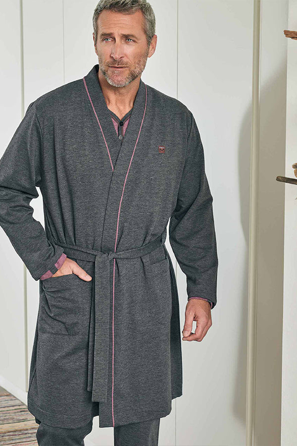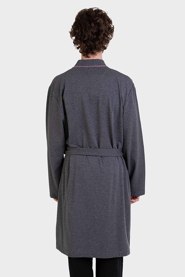Bata de hombre, larga, de punto cruzada con cinturón y dos bolsillos con detalle de vivos contrastados en escote.