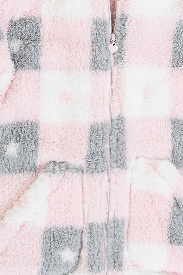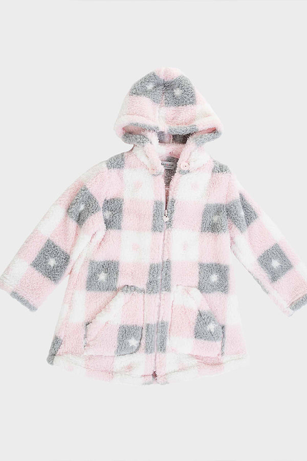 Bata de niña, larga en tejido polar con efecto borreguet estampado de cuadros en tonos pastel y cierre de cremallera. Tiene capucha que se ajusta con botones al cuello y es extraíble y con bolsillos en ambos lados