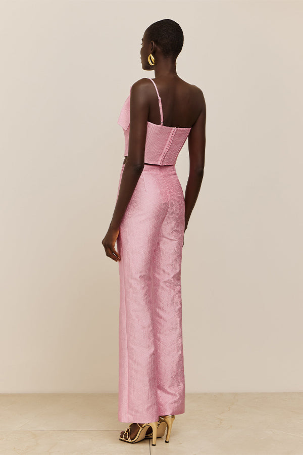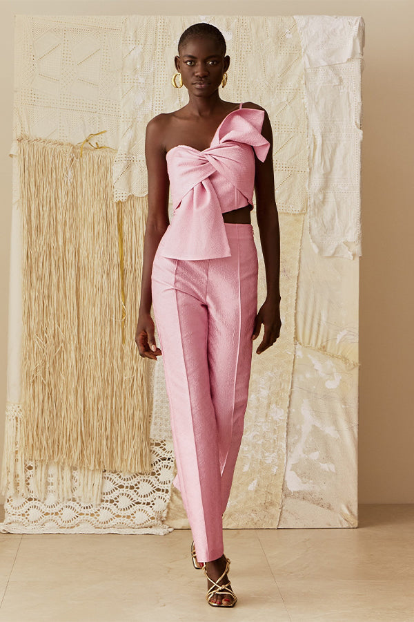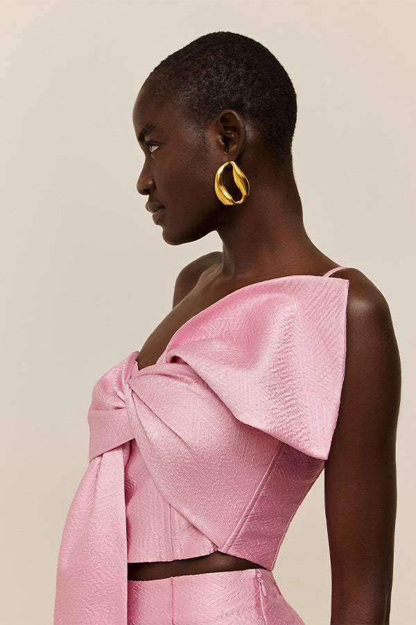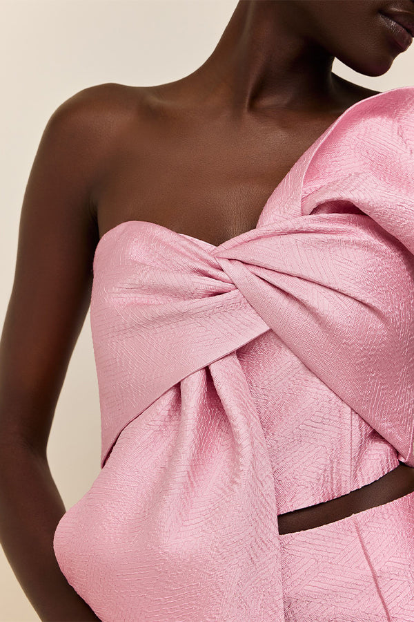 Top de jacquard palabra de honor, cerrado en espalda con cinta corsetera. Tirante en un hombro y detalle de lazo en el delantero.