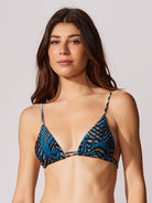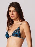 Top tipo cortina estampado con cordón doble para atar en la espalda. Posee canaletas para ajuste en la base del top y regulación en los tirantes. Espuma extraíble.