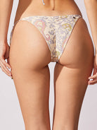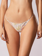 Bottom de bikini de lazo estampada, con laterales finos ajustables con puntas de metal en baño de oro viejo, tiene un ligero fruncido en la parte trasera que crea el efecto "levantacola". Cobertura pequeña. Tejido: Microfibra Beach