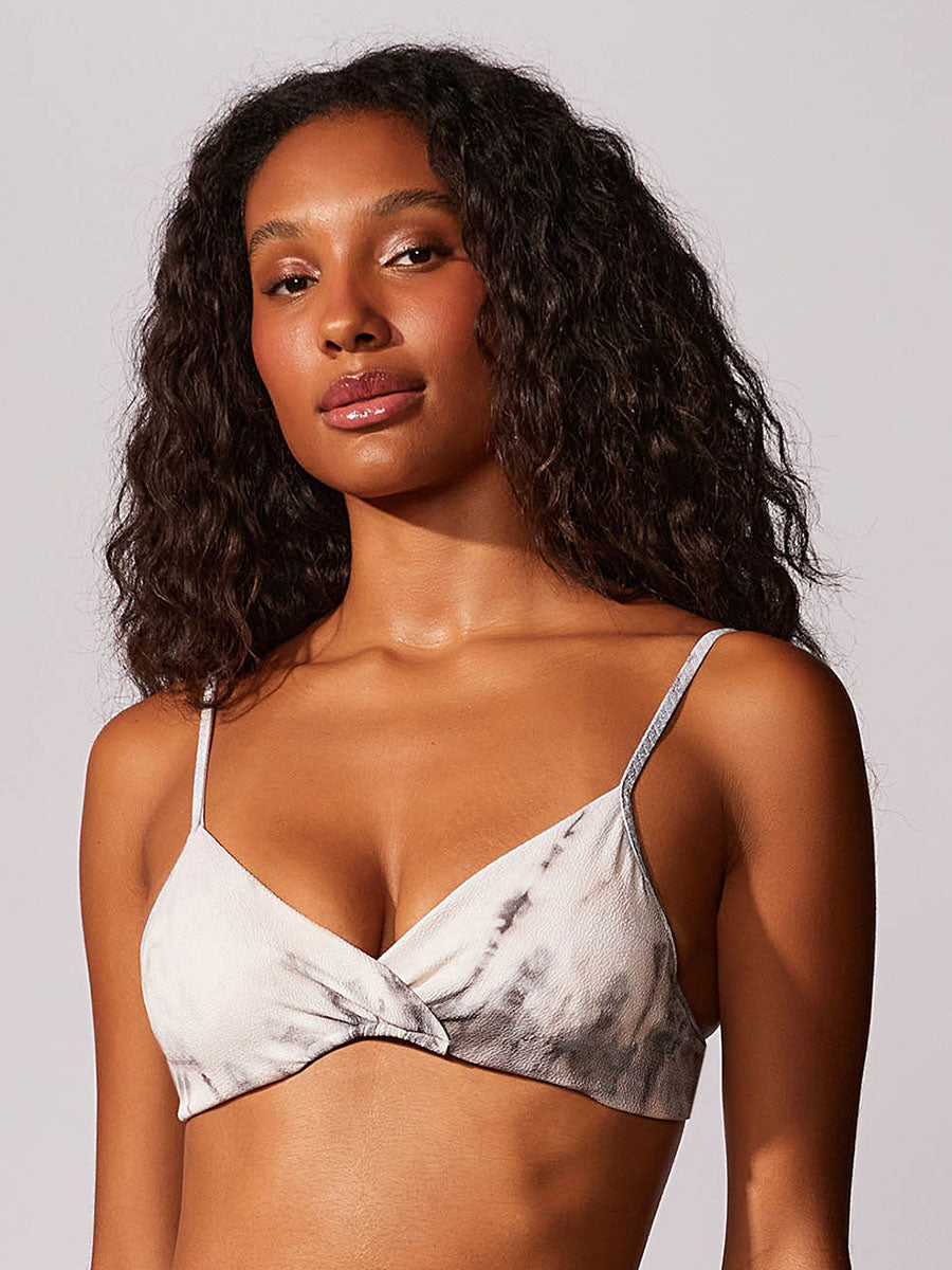 Top de bikini media copa estampado con tirantes fijos con regulación, aro para mayor soporte y detalle cruzado en el frente con ligero fruncido. La prenda tiene atado en la espalda y adornos en baño dorado. Copa removible.