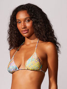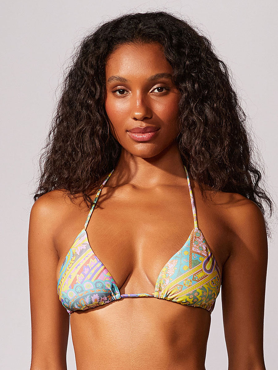 Top de bikini estampado tipo cortina, ajustable con tiras finas para atar en el cuello o en la espalda. Relleno removible. Tejido: Microfibra Beach