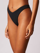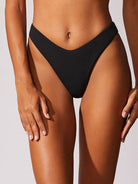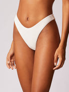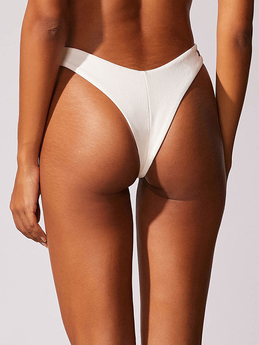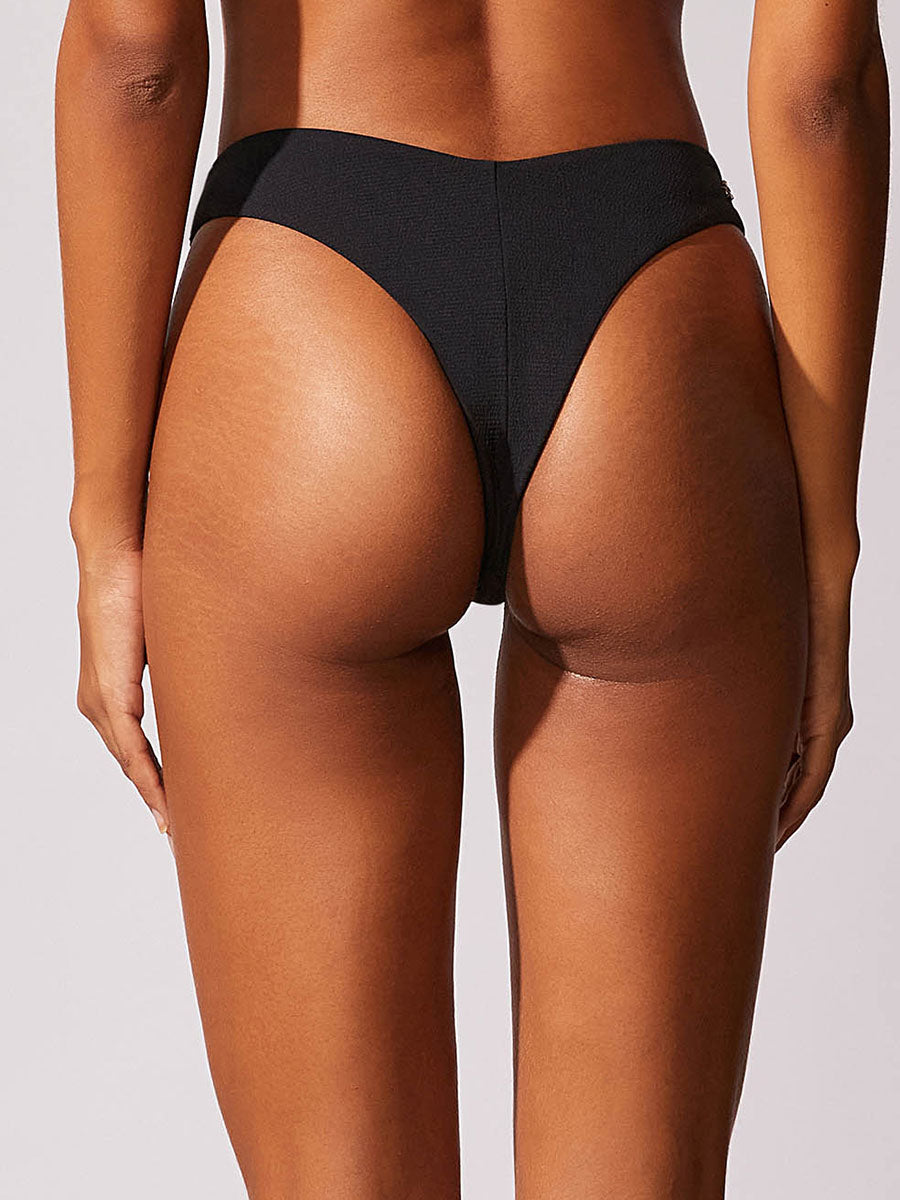 Bottom de bikini de hilo doble lisa con corte alto y cobertura pequeña, posee recorte central. Detalle de logo en baño de oro envejecido en la espalda.