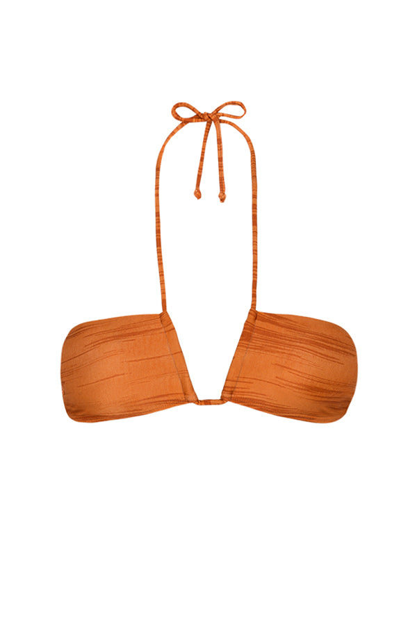 Top de bikini tirantes tipo halter largo ajustable, con detalle de tubos metálicos en la parte del busto, copa extraíble.
