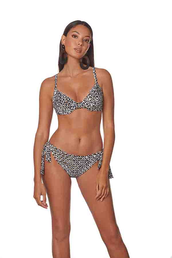 Bikini de corte clásico con copa suave y pequeño drapeado de favorecedor efecto y aro para una mayor sujeción. Tirantes regulables. Siempre de pura tendencia, el estampado corbatero es un must de estilo que, gracias al color y los alegres motivos gana en fuerza y elegancia.