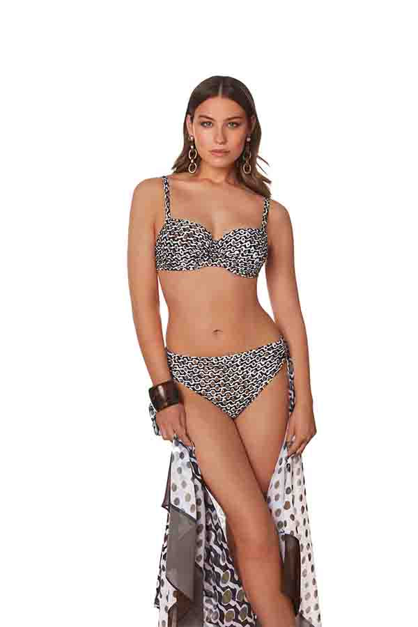 Bikini de capacidad de dos piezas. Diseñado para ofrecer máxima sujeción y confort hasta en tallas superiores, lleva una copa interior y aro para un mayor soporte. Tirantes regulables y a medida que la copa aumenta, el tirante es más ancho. Atractivo, poderoso e intenso, este estampado con motivos gráficos es un must de estilo con un denominador común: elegancia máxima.