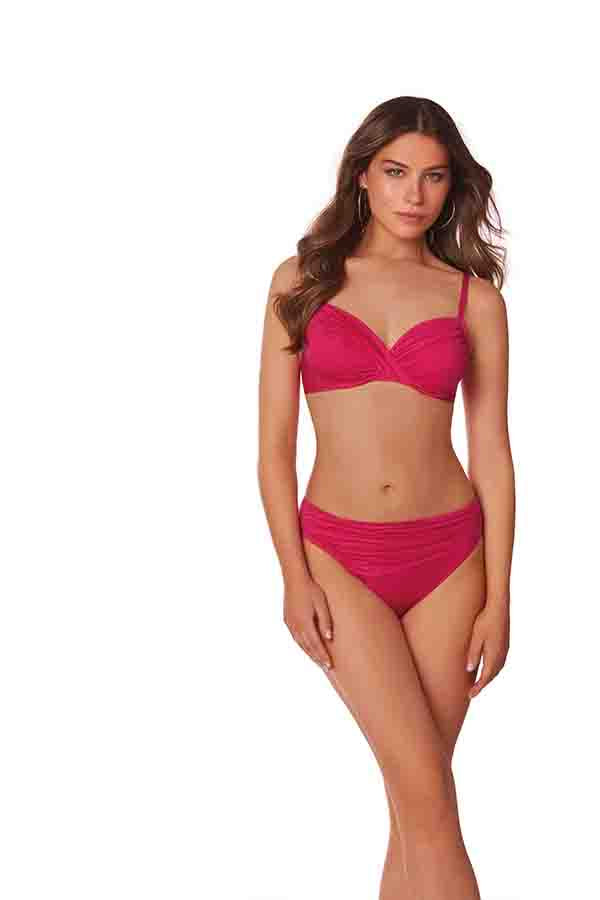 Bikini de dos piezas. Corte favorecedor para dar soporte hasta en las tallas más grandes. Su aro y corte entrelazado realza el busto de forma natural además de ofrecer una alta sujeción. Interior y lateral forrado de tul con soporte de media luna y tirante regulador que aumenta su ancho en función de la talla, adaptándose a ti. A juego con braga básica de corte alto y lateral ancho para un mayor confort.