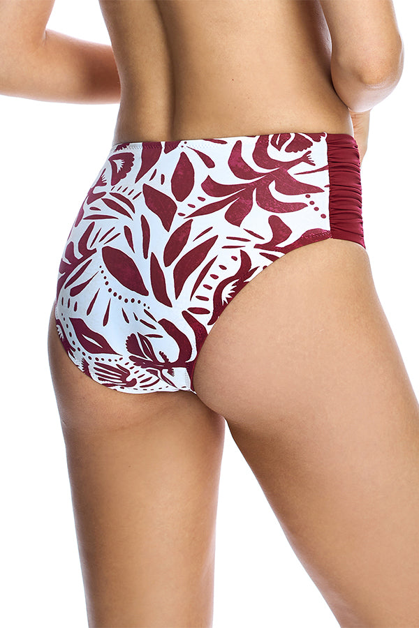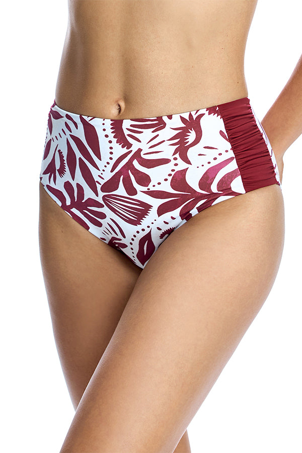 Bottom de bikini talle alto con estampado étnico en tonos granates. Completamente forrada. Tejido de vanguardia con un alto poder moldeador, con una alta resistencia al cloro, cremas y aceites bronceadores y excelentes propiedades de absorción de la humedad.