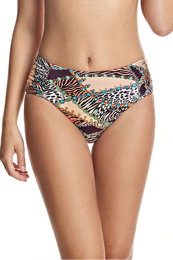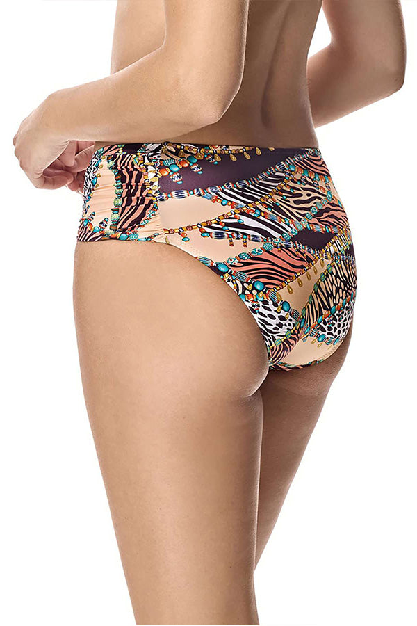 Bottom de bikini, costado más alto con frunces laterales con estampado animal print en tonos granates. Completamente forrada.
