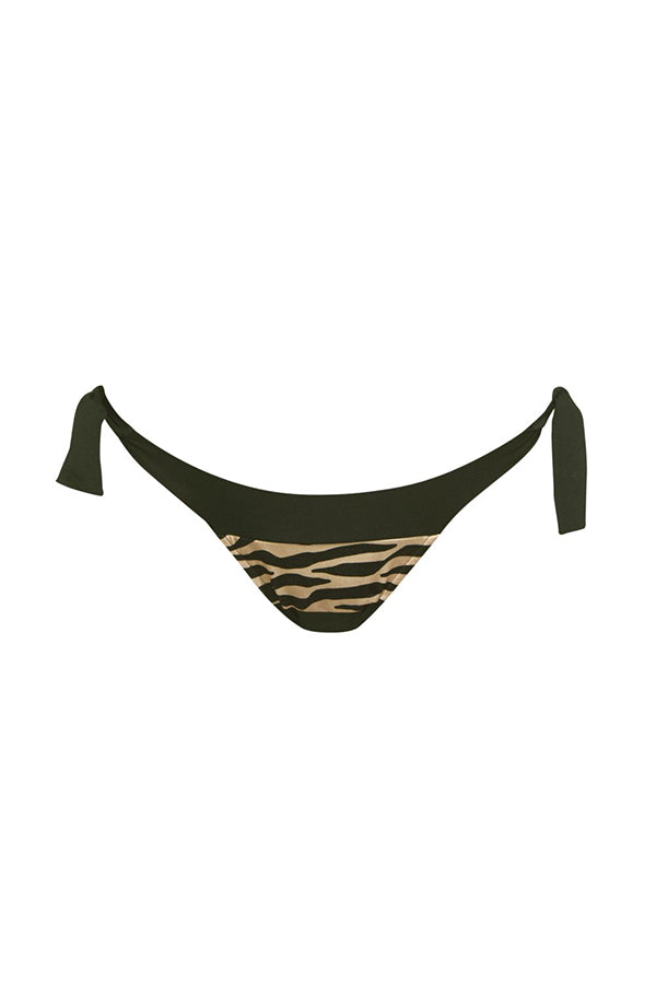 Bottom de bikini con lazos a los costados. Con el mismo juego de yuxtaposición de estampado y tejido liso.