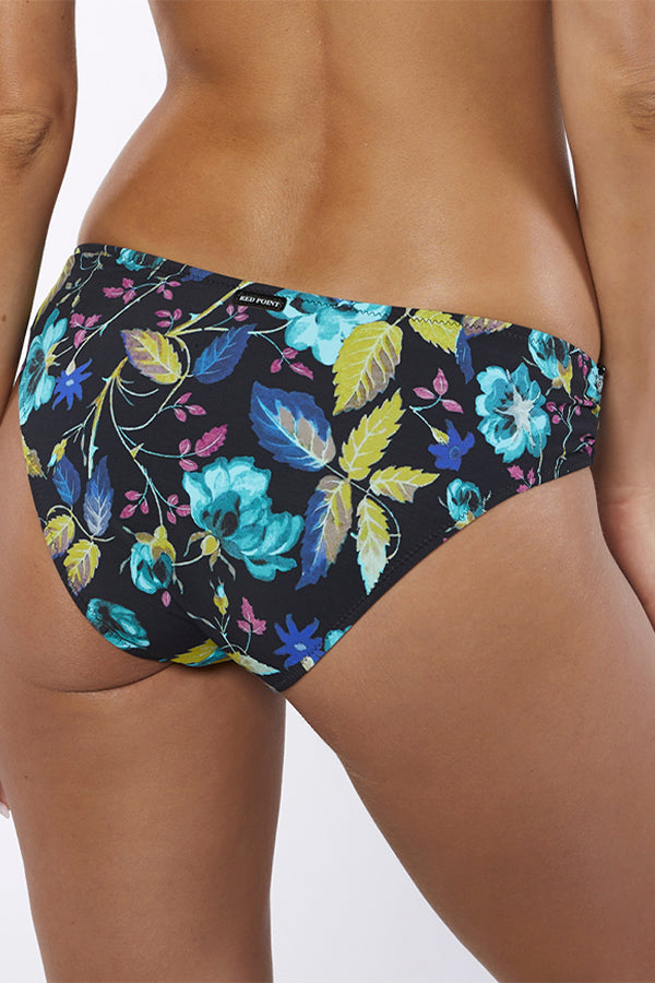 Bottom de bikini con estampado floral de colores ácidos sobre fondo negro. Formas más juveniles con adorno en forma de V. Corte clásico con cobertura media.