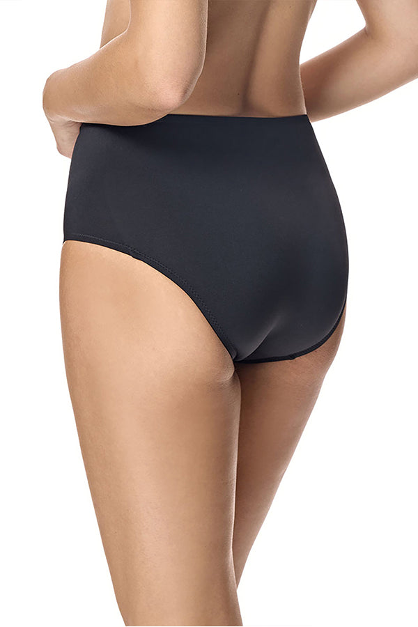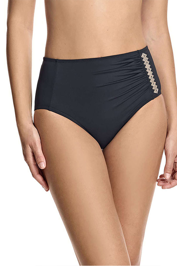 Bottom de bikini básica en tejido liso en color liso, fruncida en el lateral y con detalle. Completamente forrada.