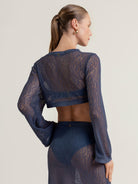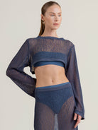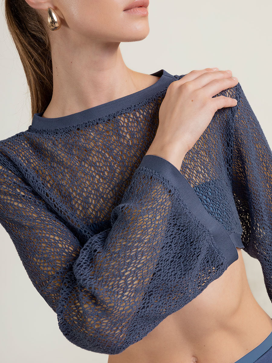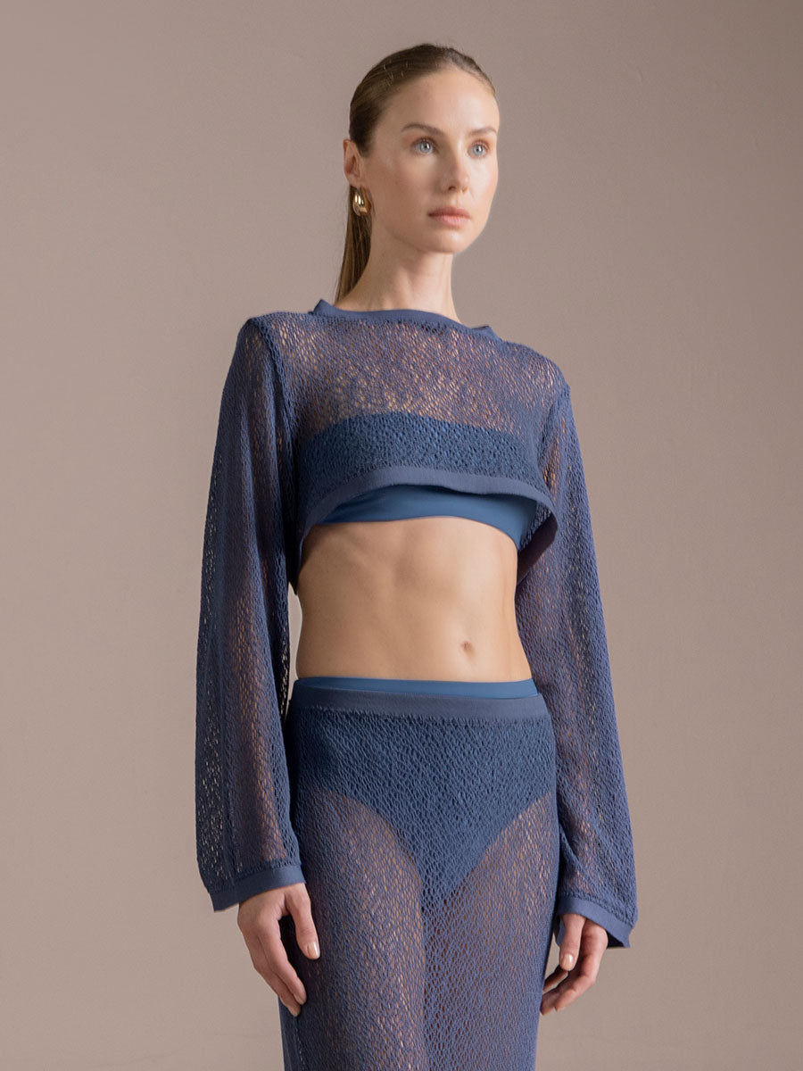 Crop top de manga larga en tejido de red con mezcla de algodón reciclado en color azul, cuello acanalado y manga larga, detalle de moneda característico de nuestra marca con "t" grabada en oro - bañada para evitar la oxidación.