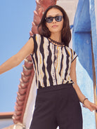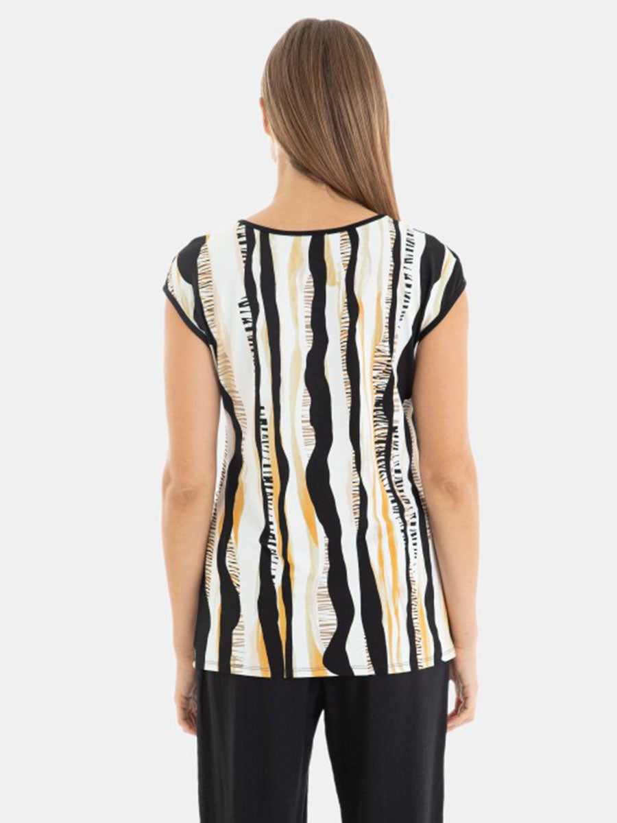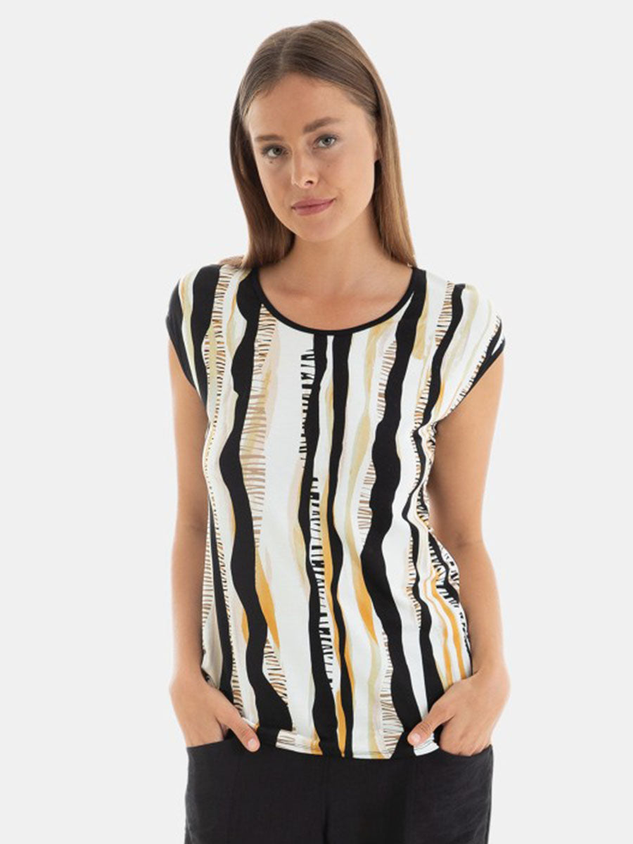 Camiseta de mujer de hombro caído y cuello redondo con estampado a rayas en diferentes colores.
