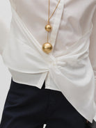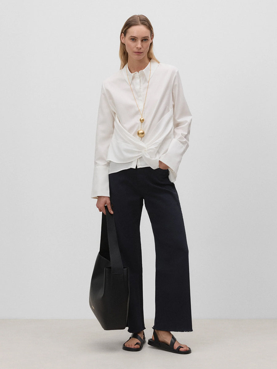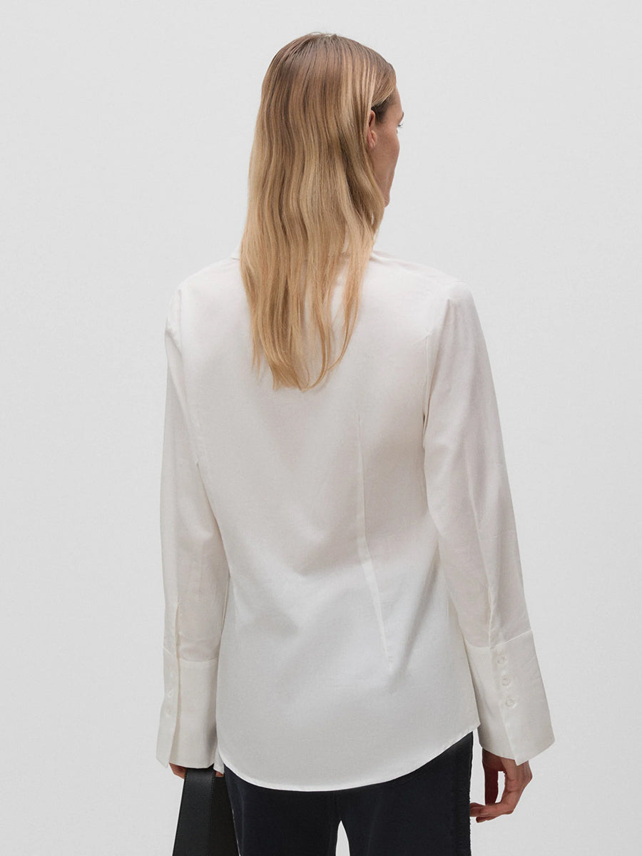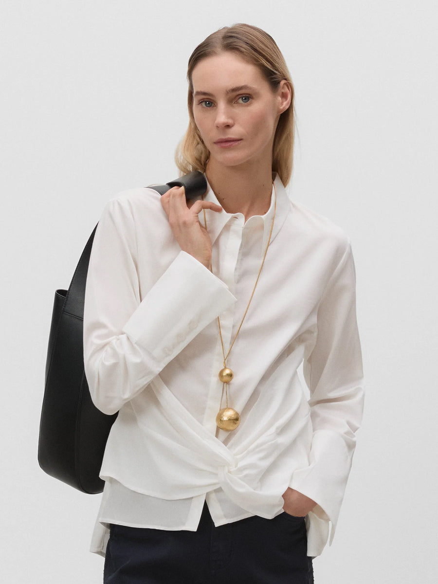 Camisa de corte entallado con nudo decorativo y cuello camisero. Cierre mediante botonadura frontal. Puños largos con botonadura.