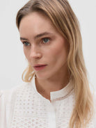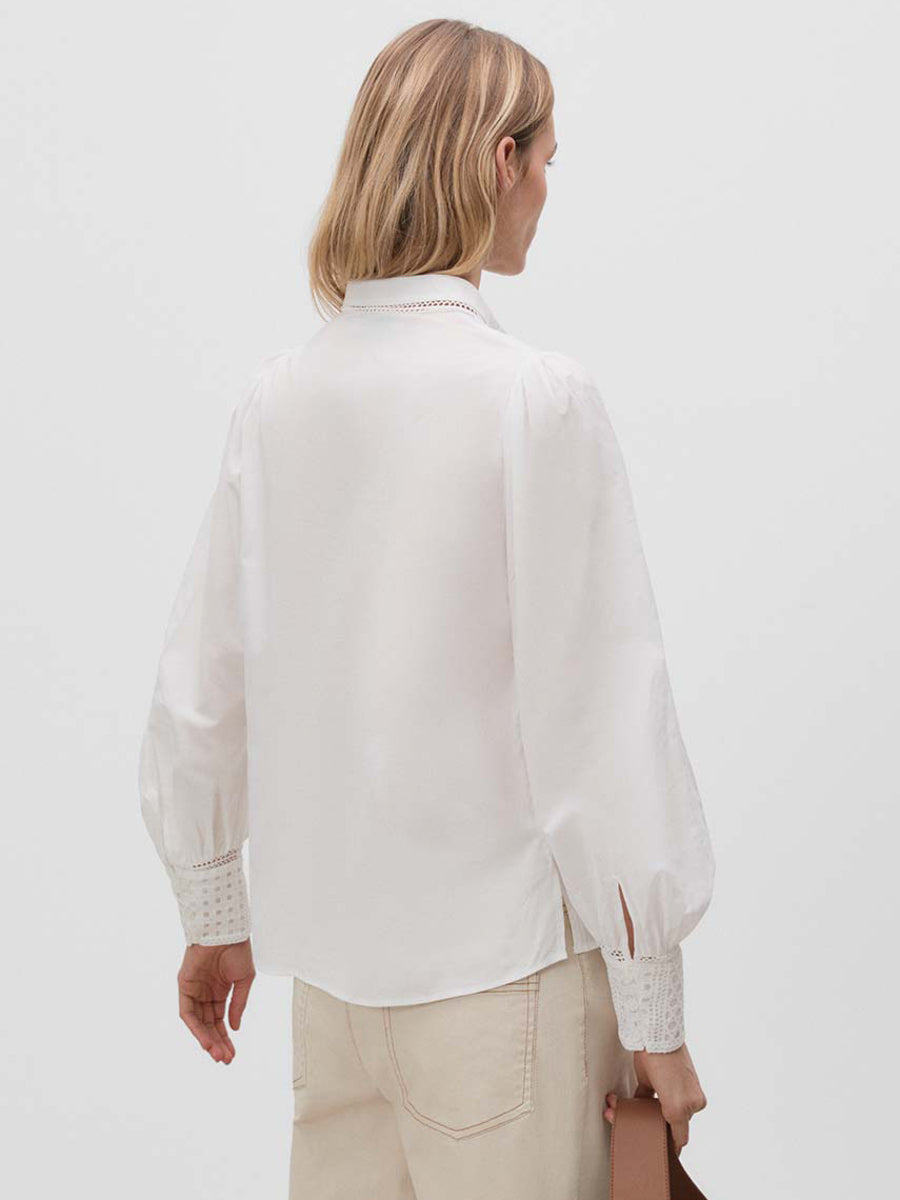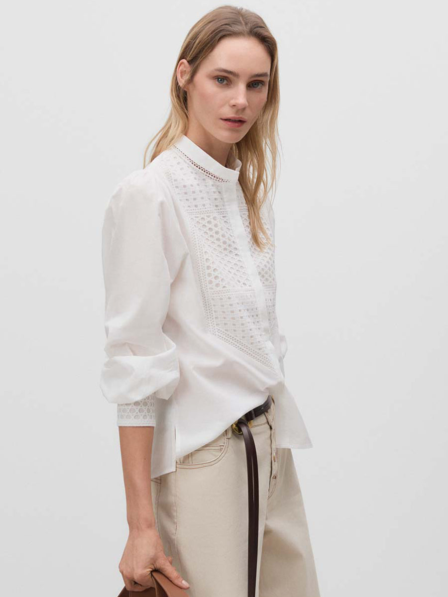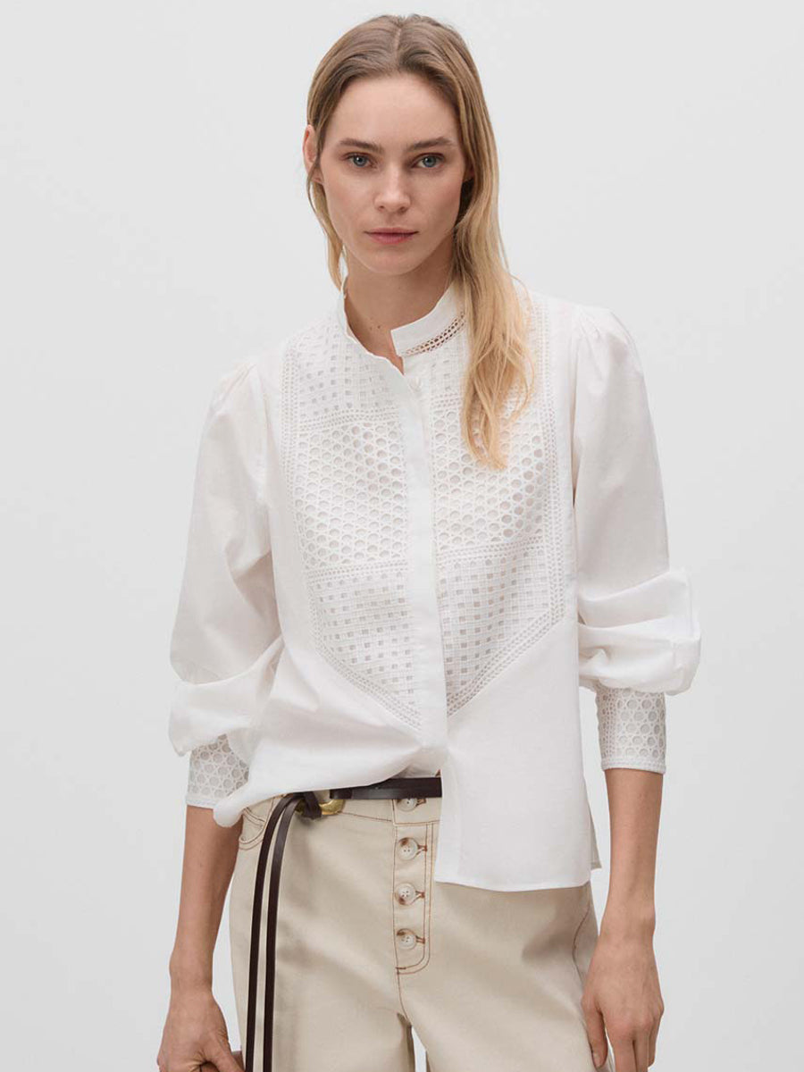 Blusa de cuello alto que combina dos tejidos y cintas decorativas. Botonadura frontal. Manga larga abullonada con puños de guipur abotonados.