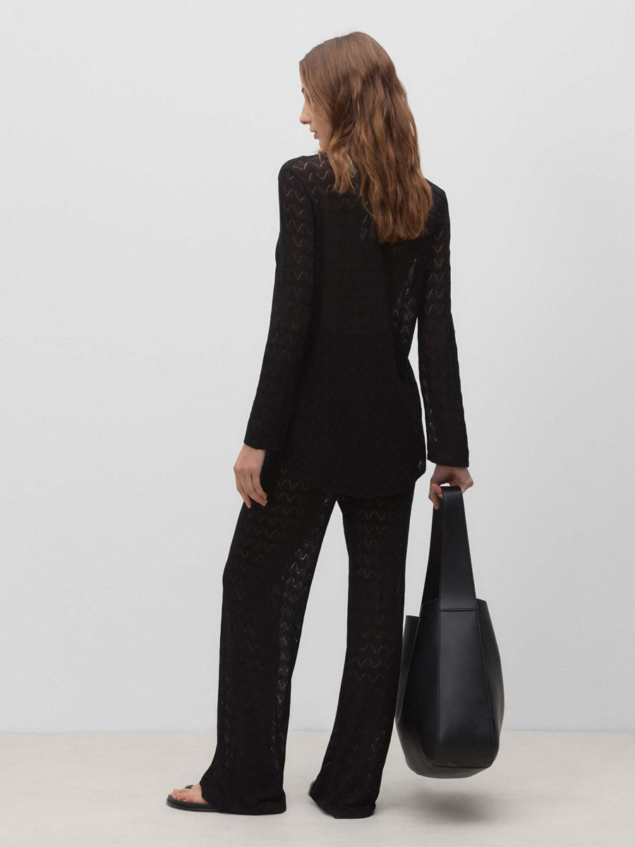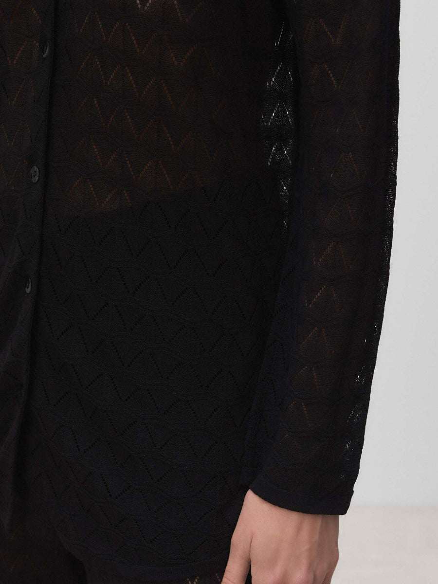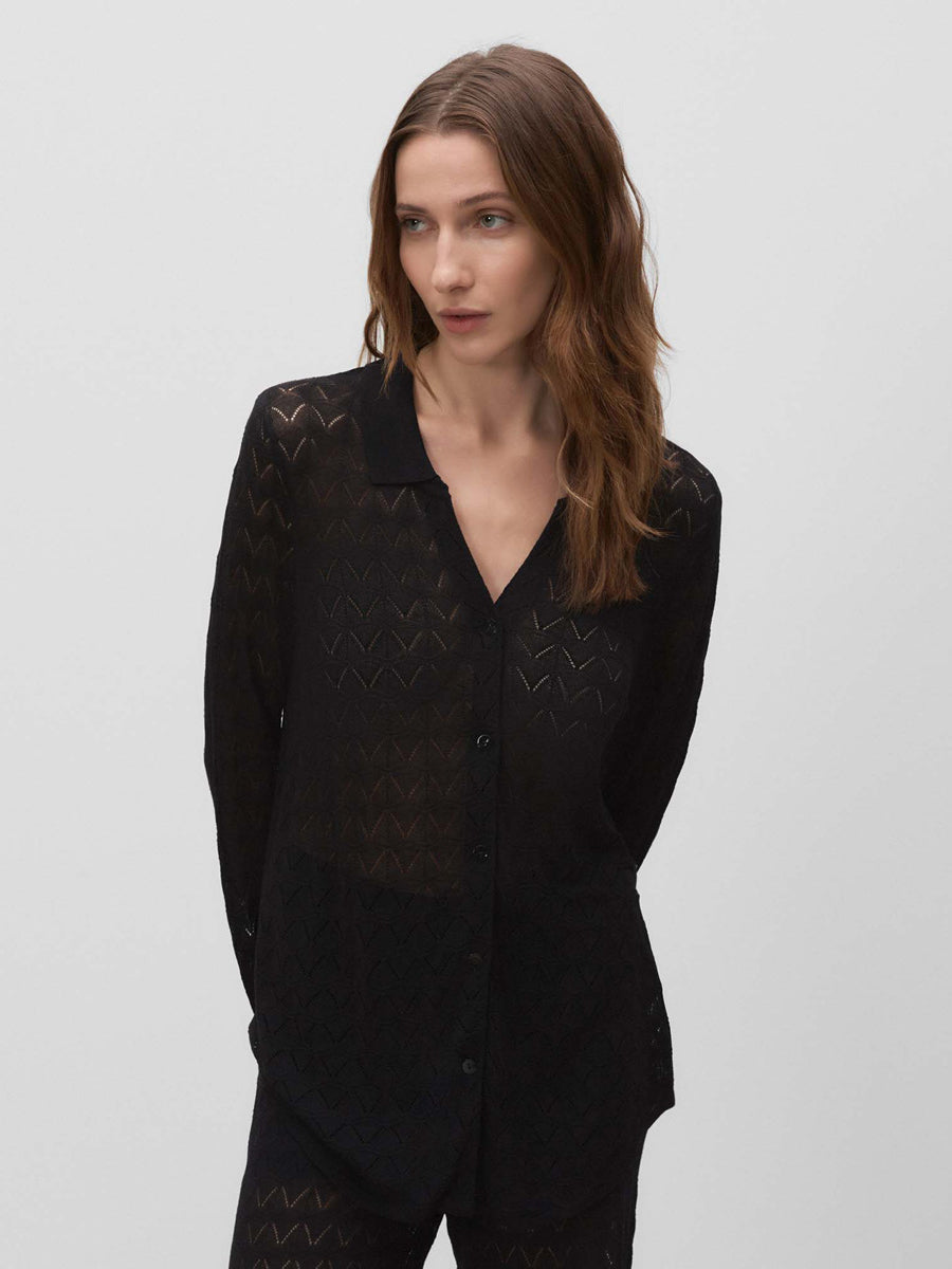 Camisa de punto acanalado con cuello camisero y manga larga. Cierre mediante botonadura frontal.