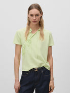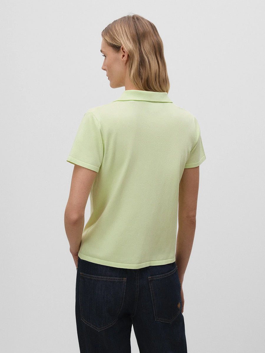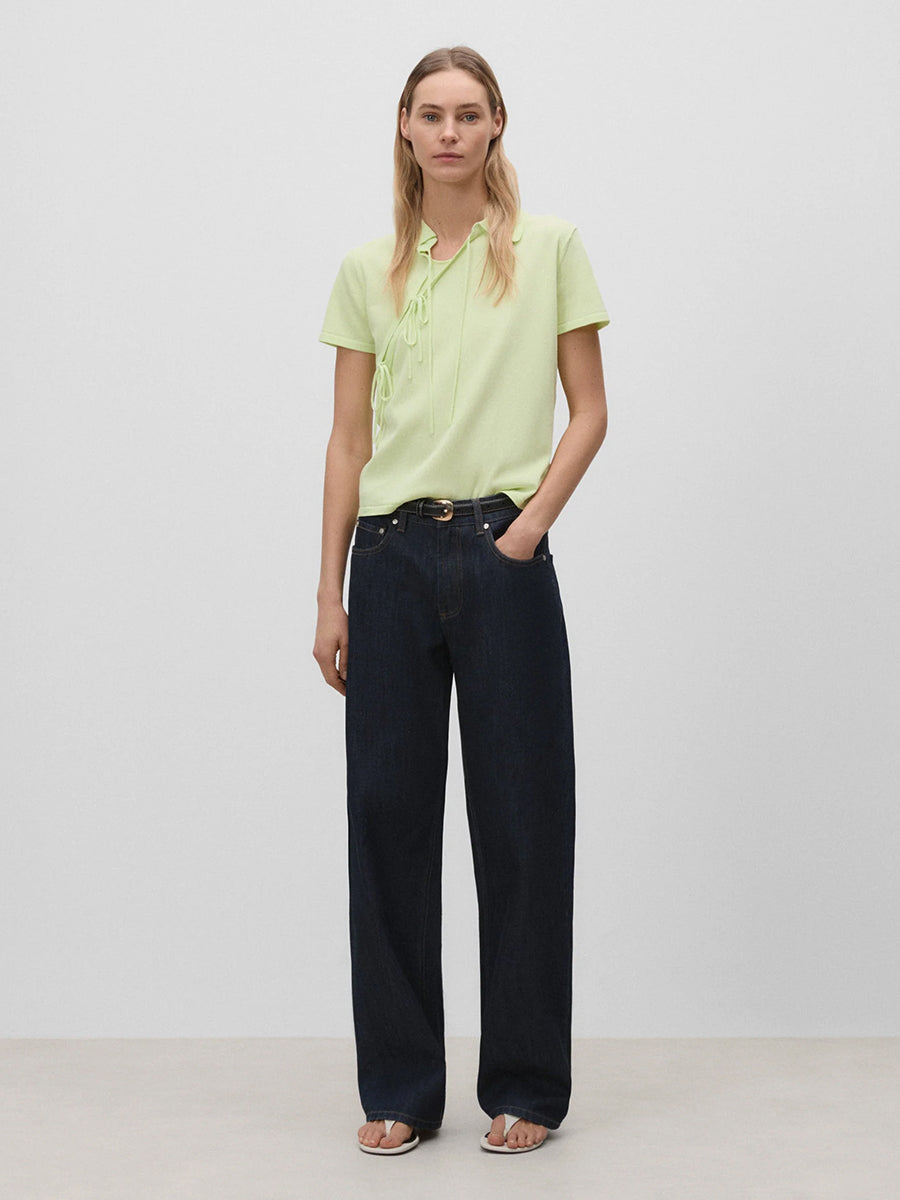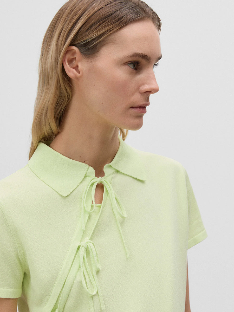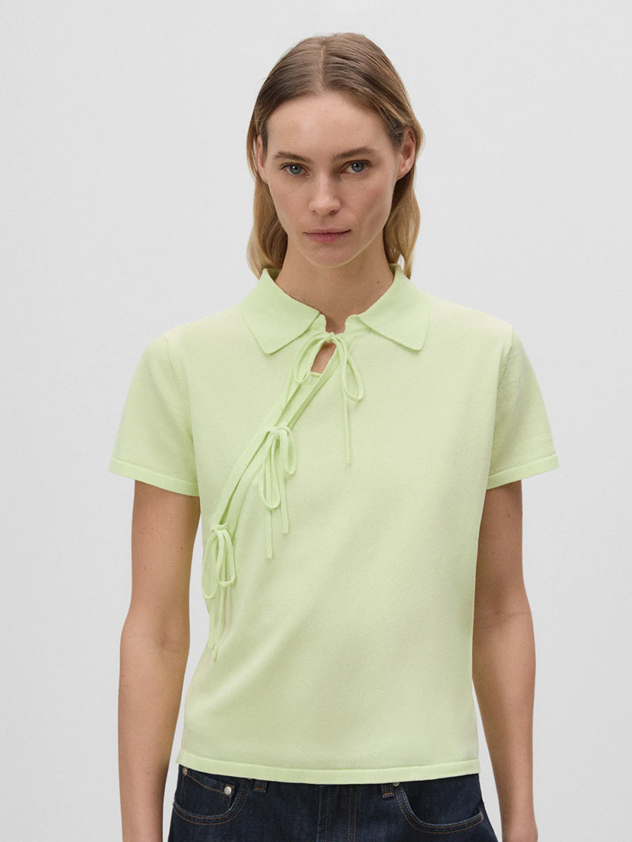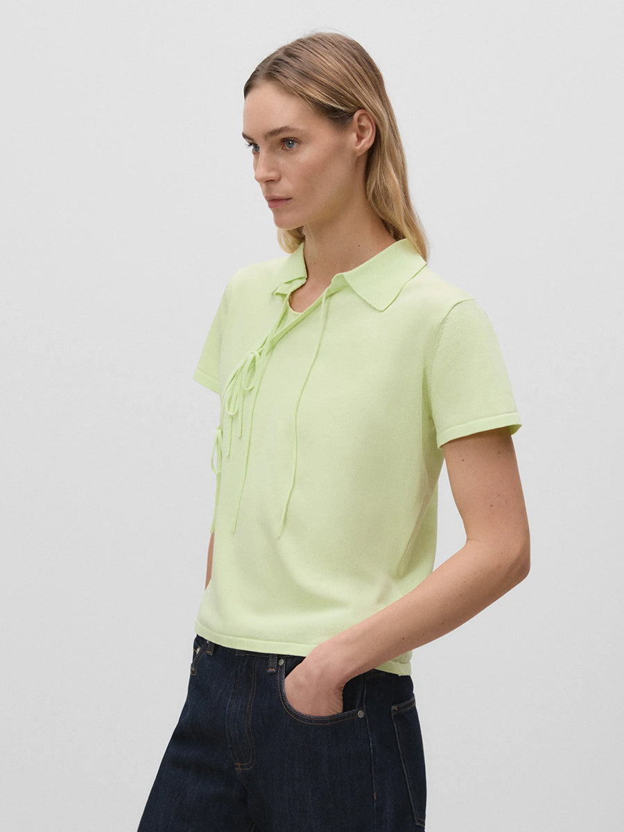 Top de punto con cuello camisero y abertura con lazos. Manga corta.