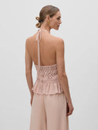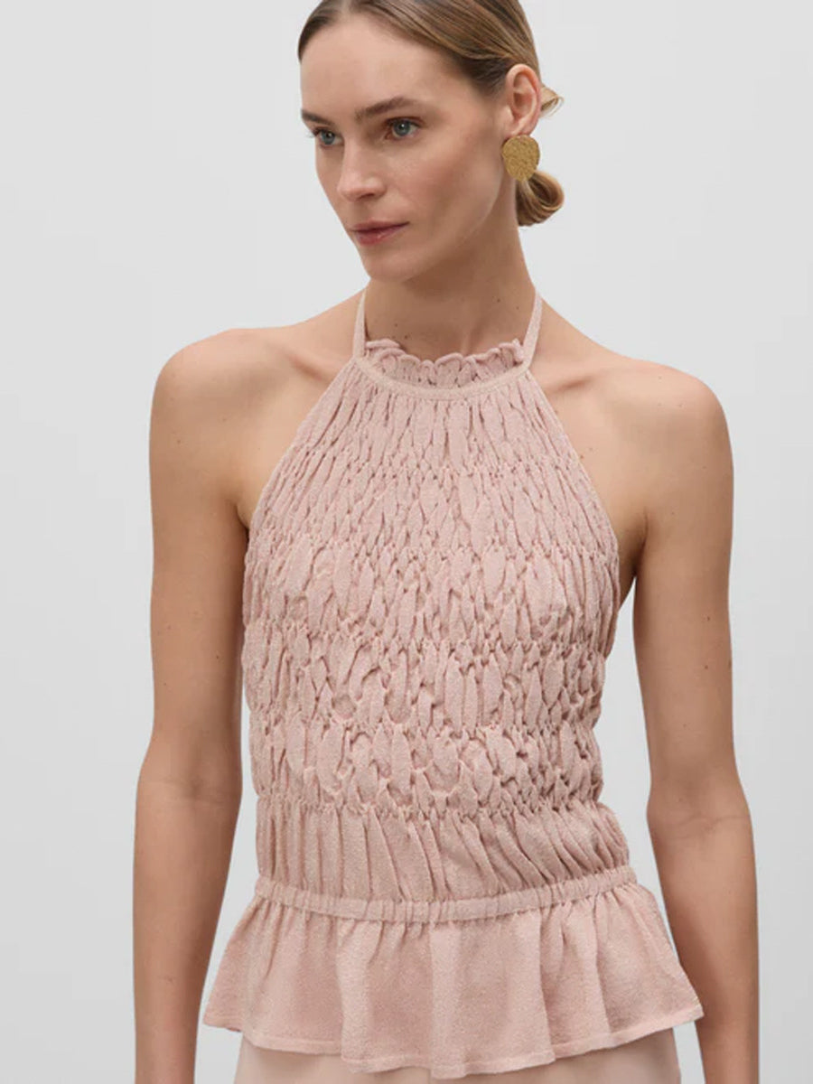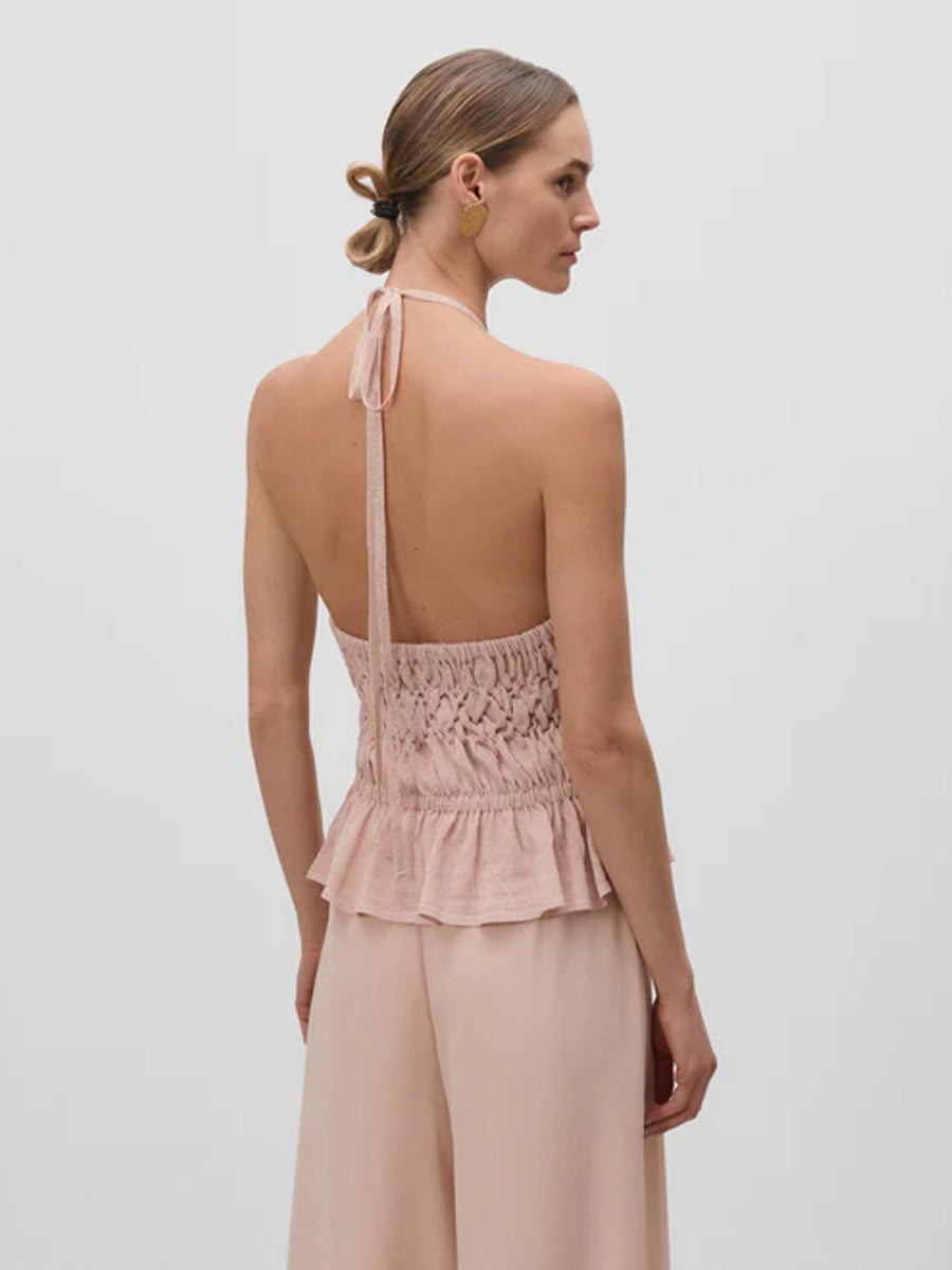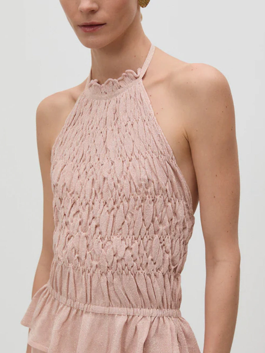 Top de punto con lúrex de escote halter y espalda descubierta.