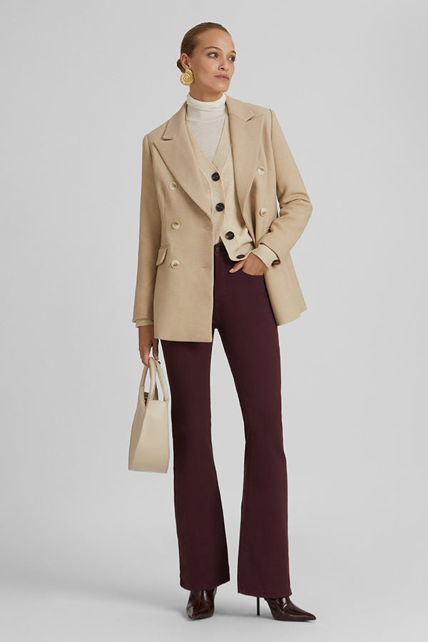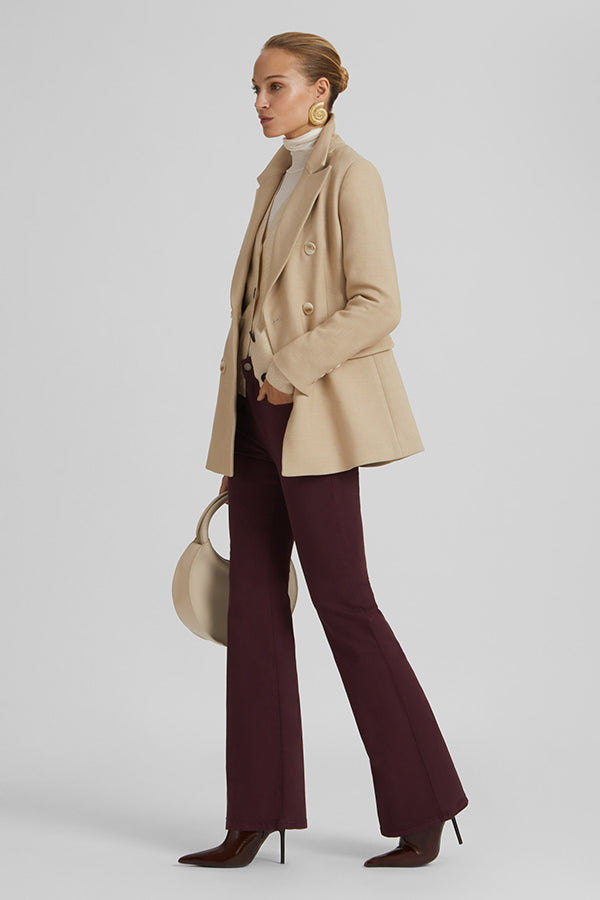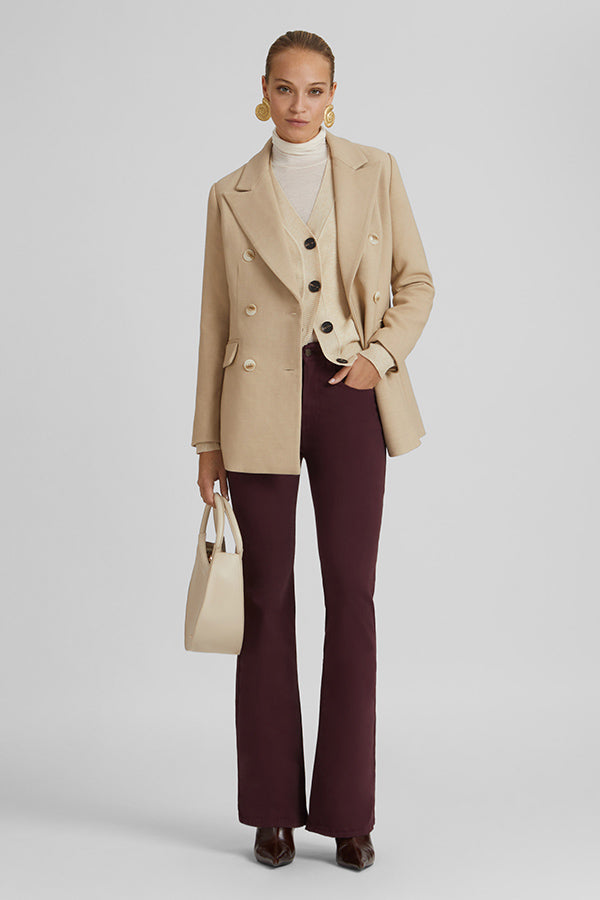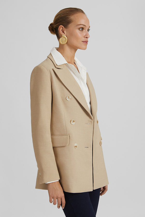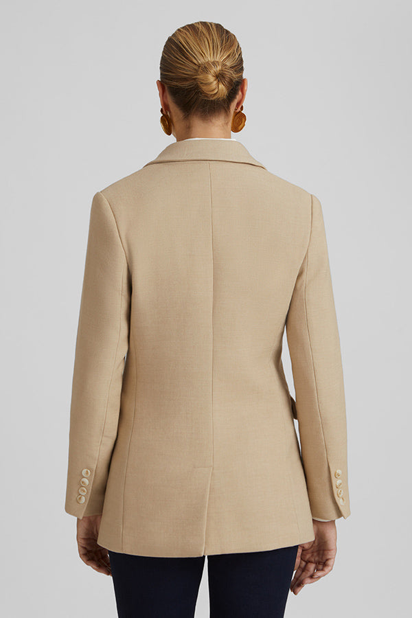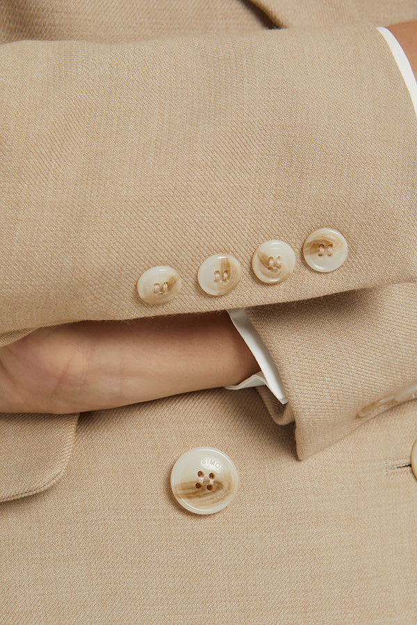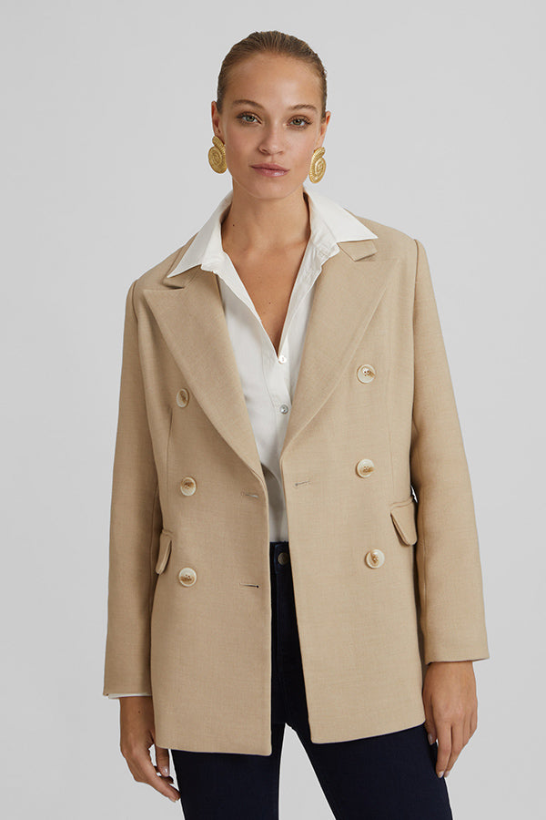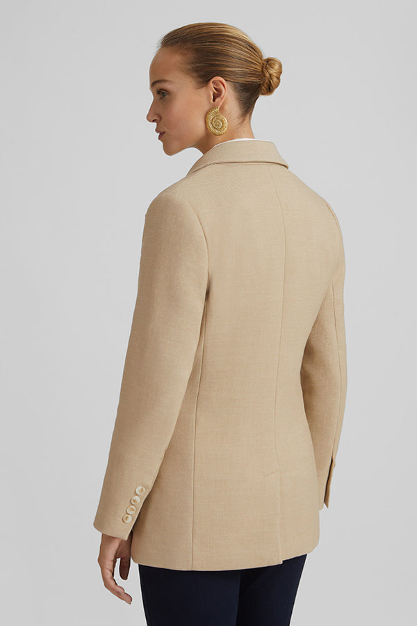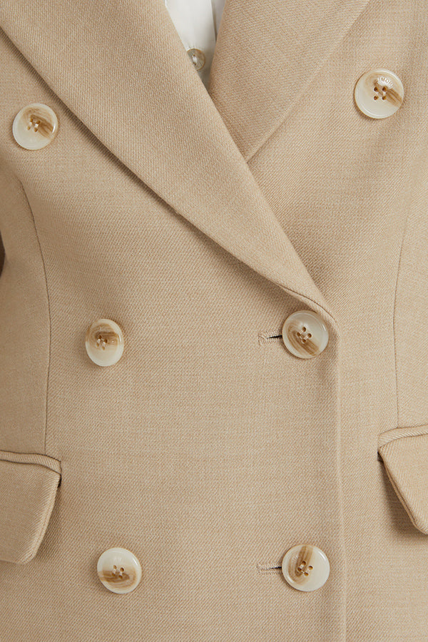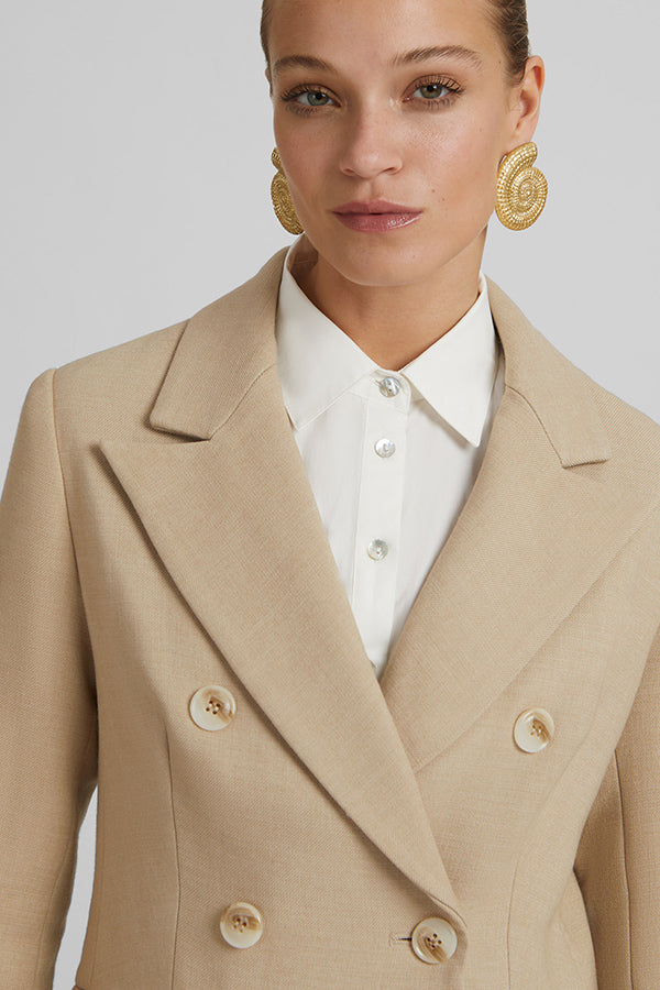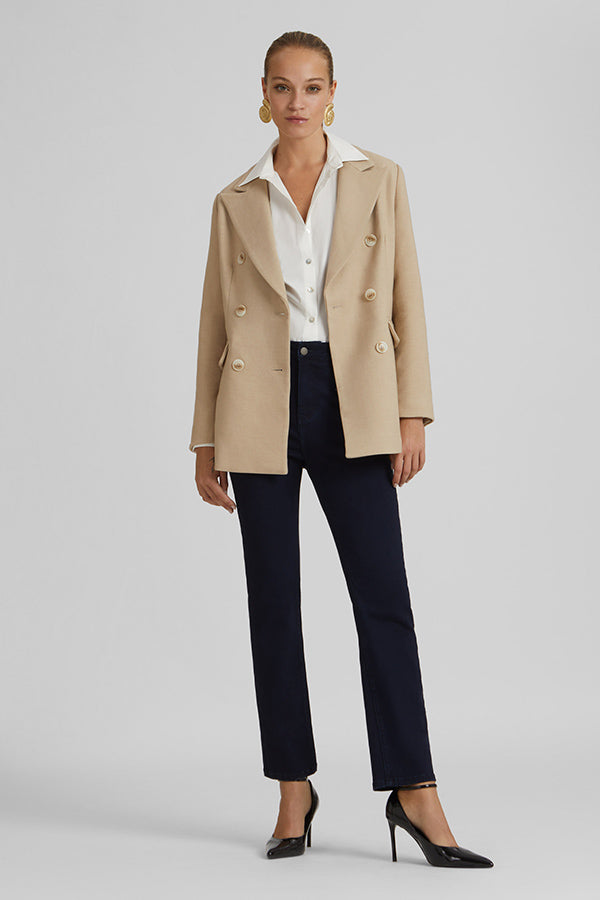 Americana con solapa de pico. Cierre mediante doble botonadura. Bolsillos con solapa. Bajo con abertura en la parte posterior..