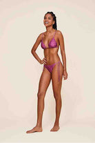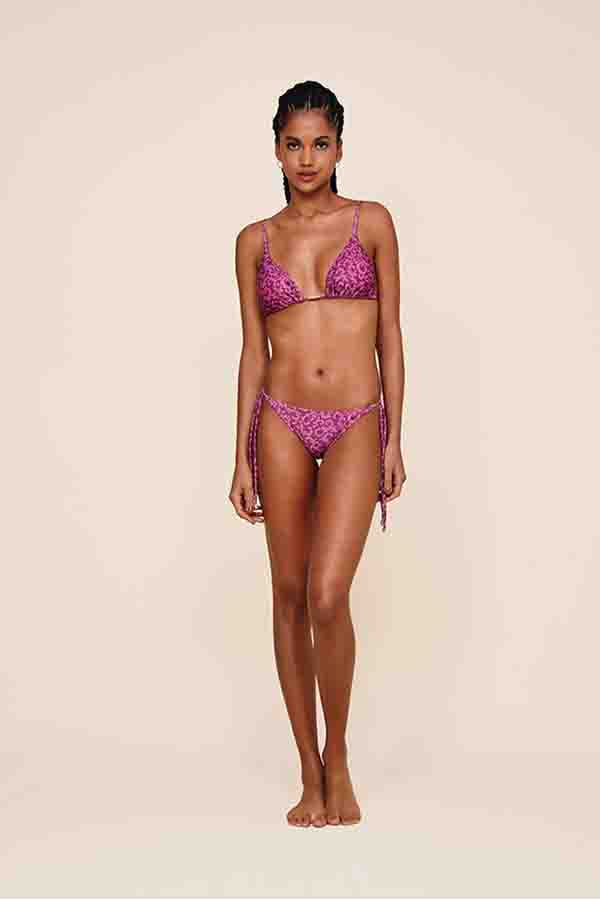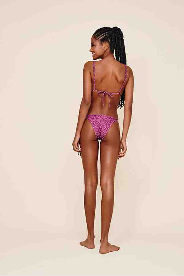 Bottom de bikini con tirantes regulables a los costados, estampado, fruncido, y un detalle de metal en la punta.