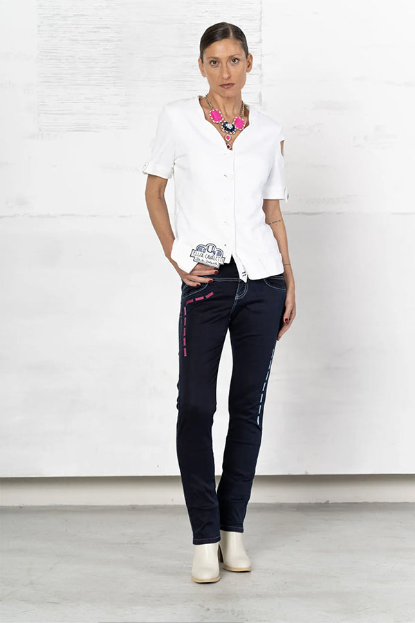 Chaqueta blanca de manga corta con bordado. Escote en pico, cierre con botones decorados a mano, mangas cortadas y detalle de logo en el bajo.
