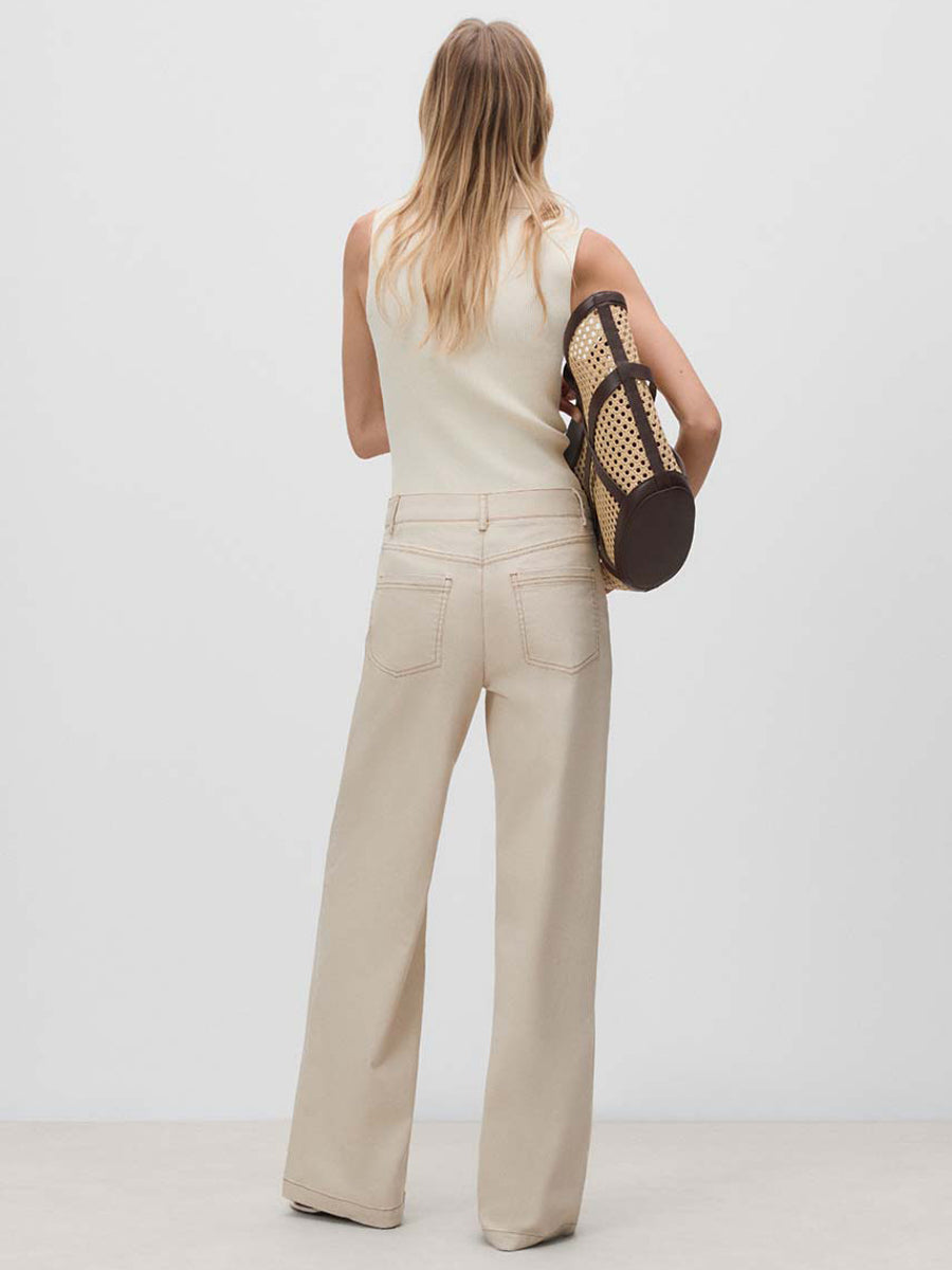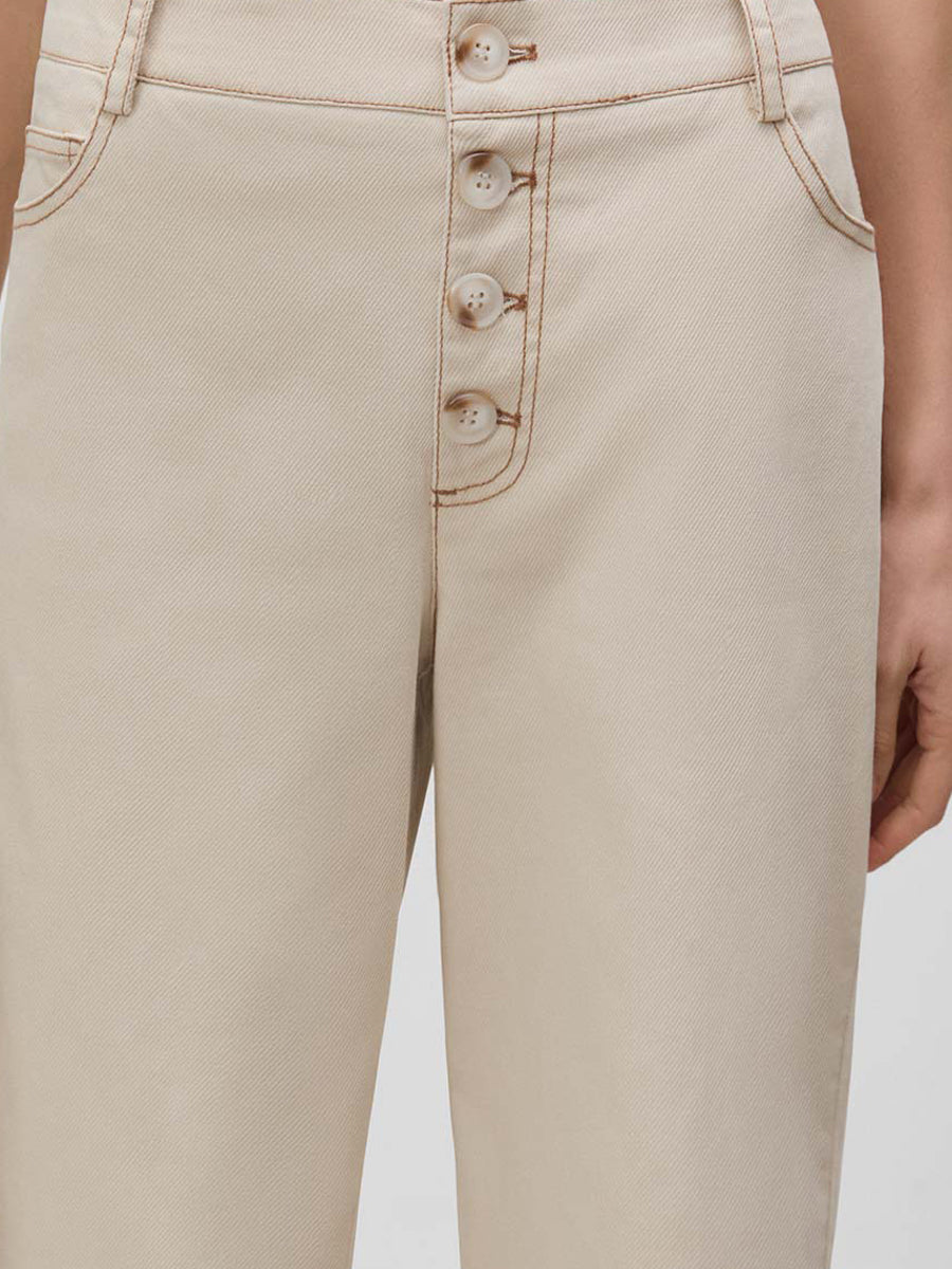 Pantalón largo de pierna ancha con cinco bolsillos. Cierre mediante botonadura frontal. Cinturilla con trabillas.
