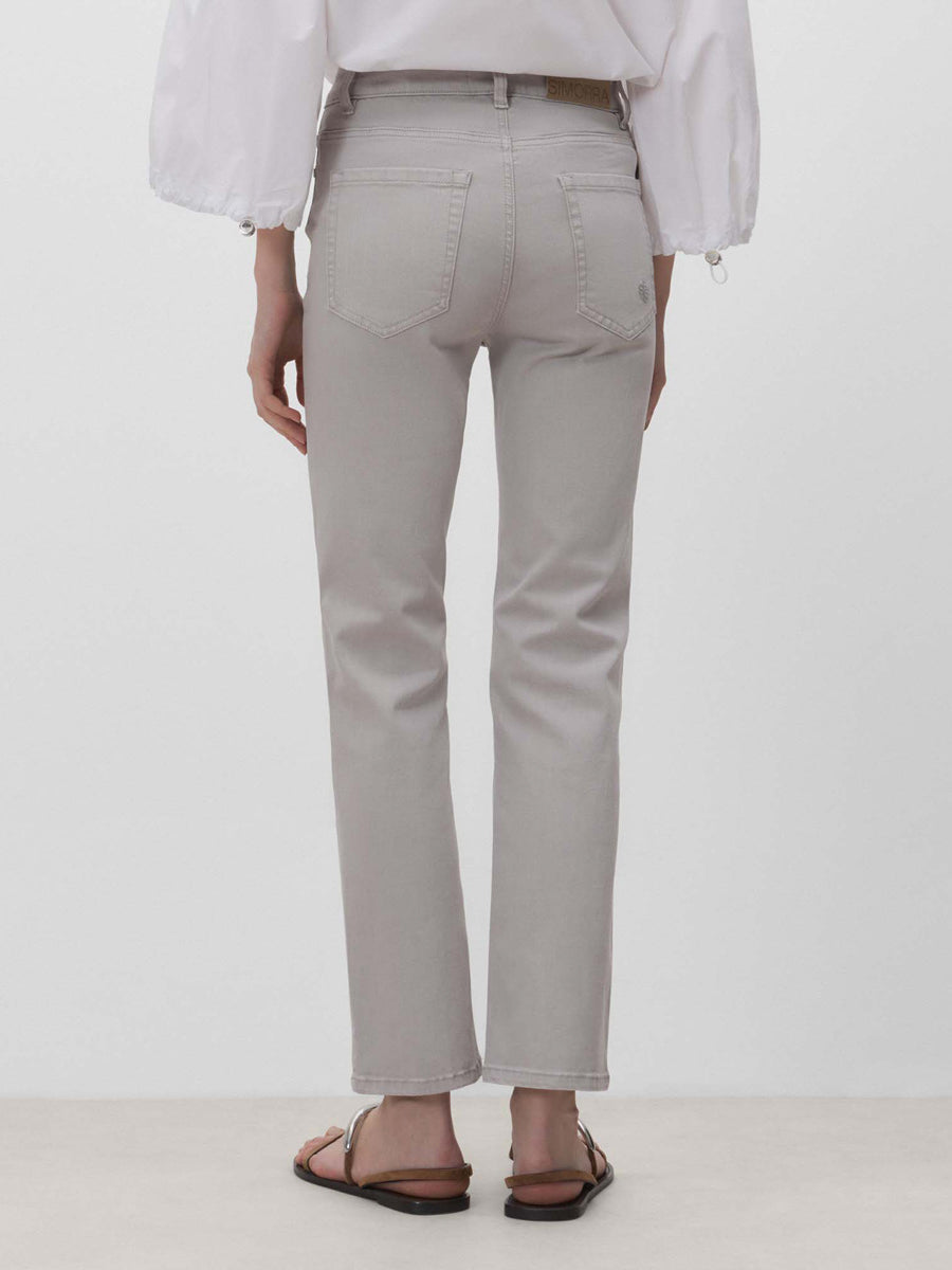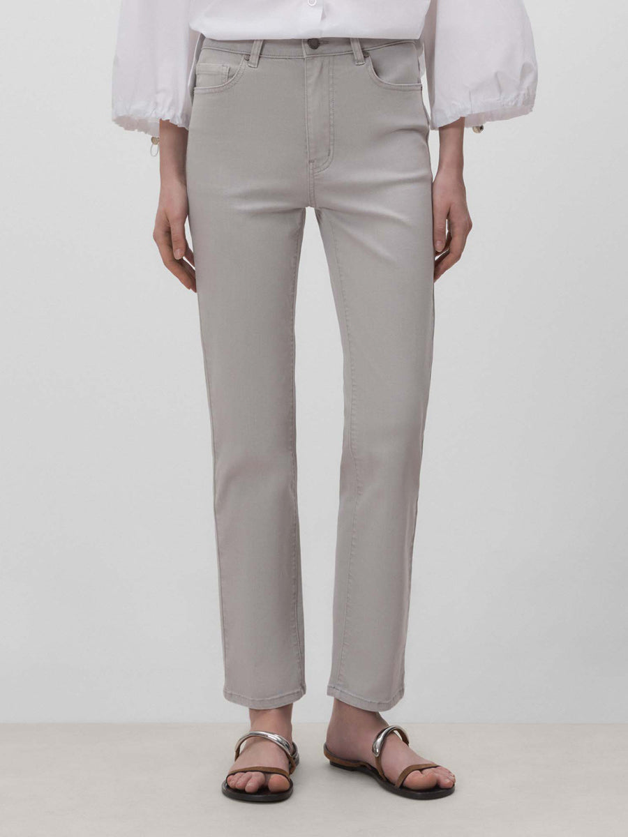 Pantalón denim cinco bolsillos de corte slim. Cierre mediante cremallera oculta por tapeta y botón. Trabillas para el cinturón.