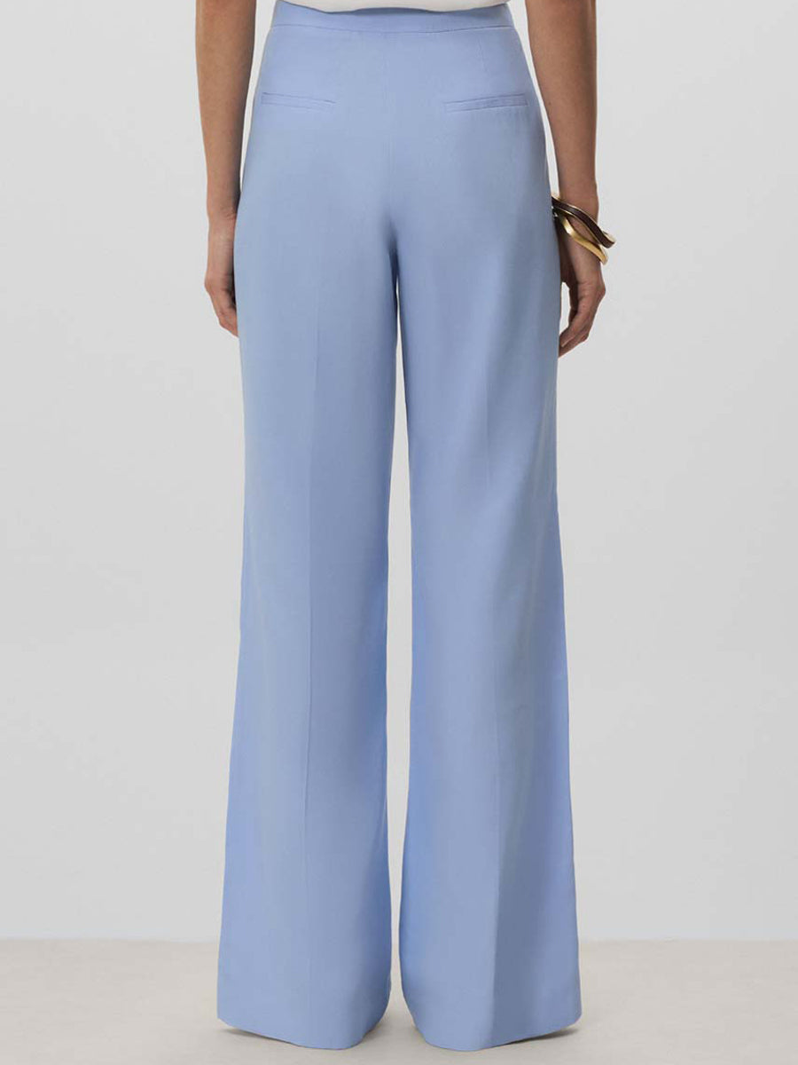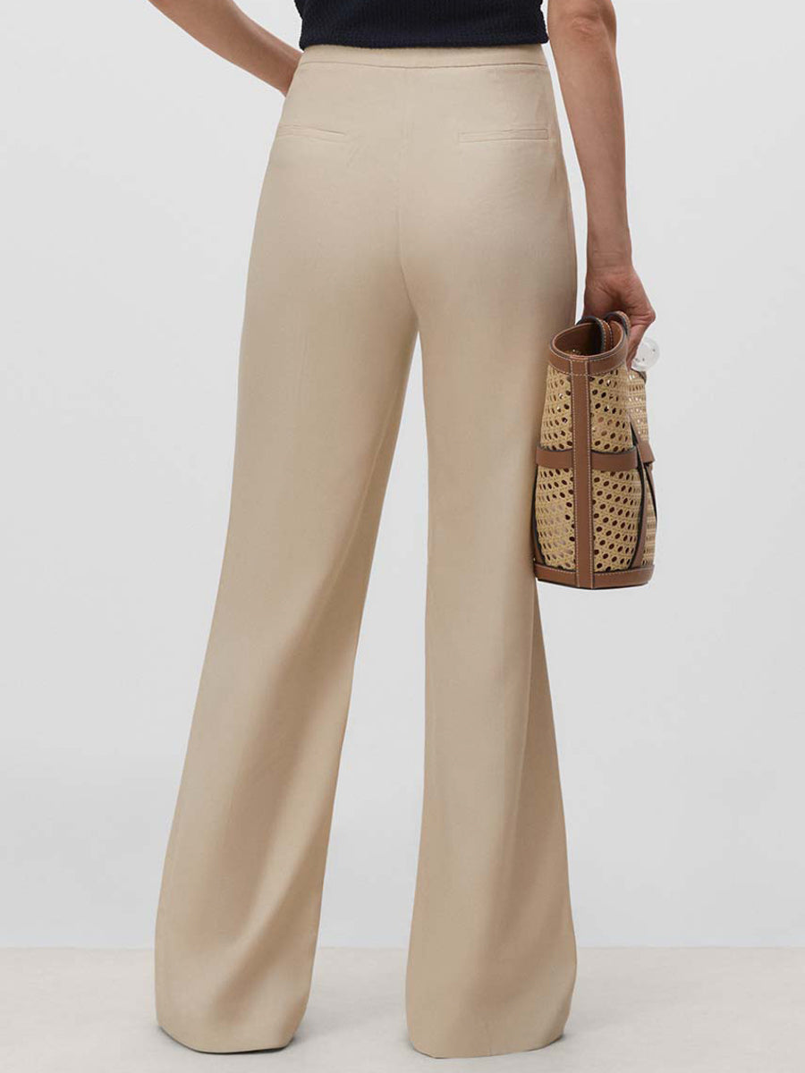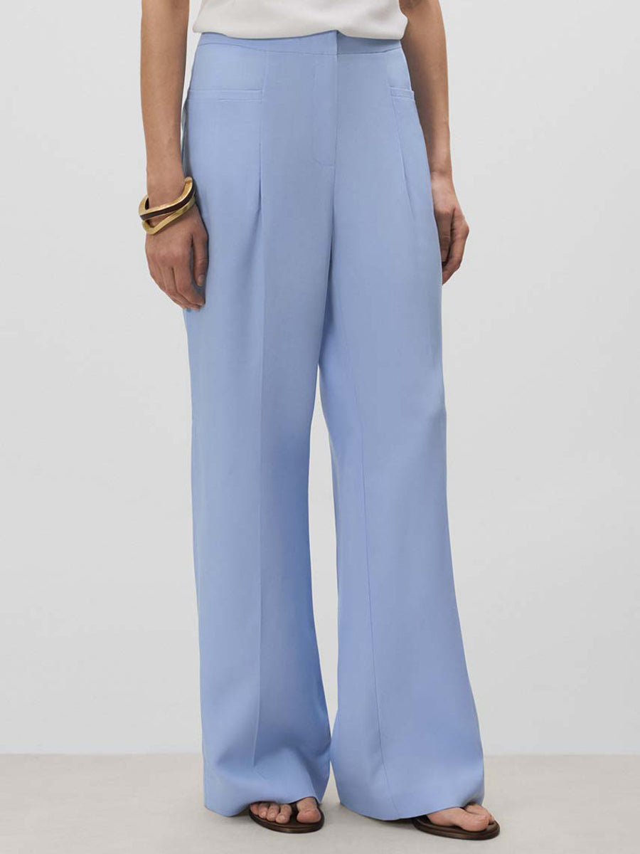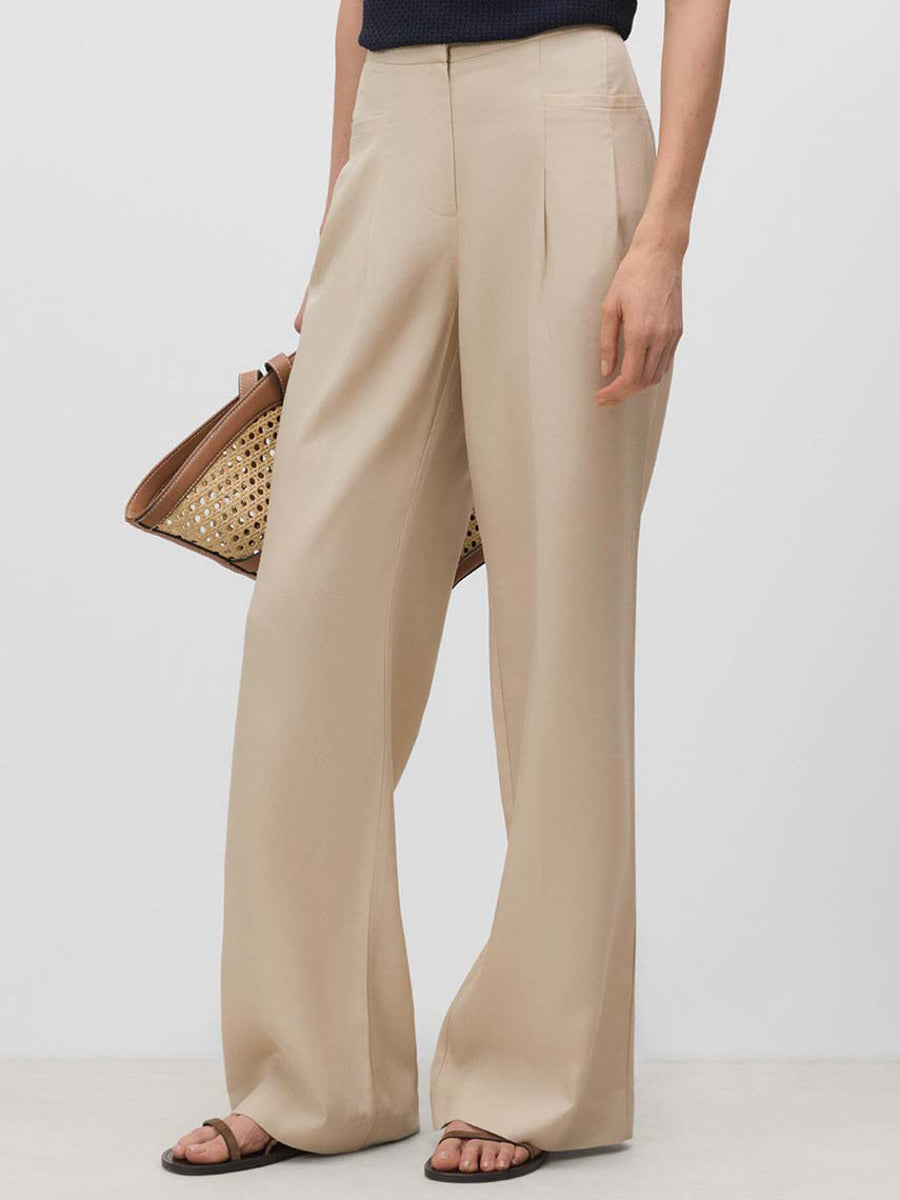 Pantalón largo de pierna ancha con pinzas y bolsillos en delantero y espalda. Cierre mediante cremallera oculta, corchetes y botón