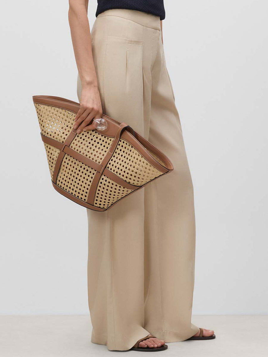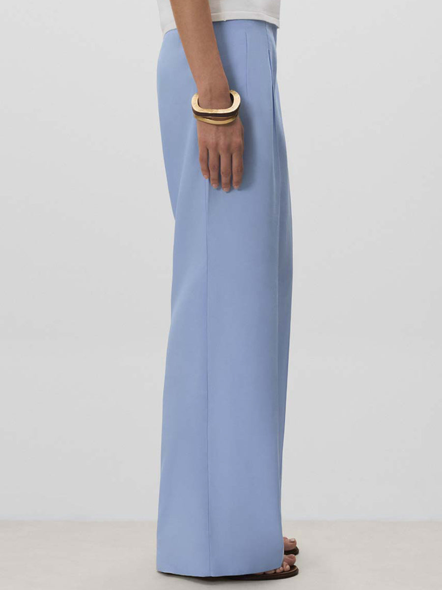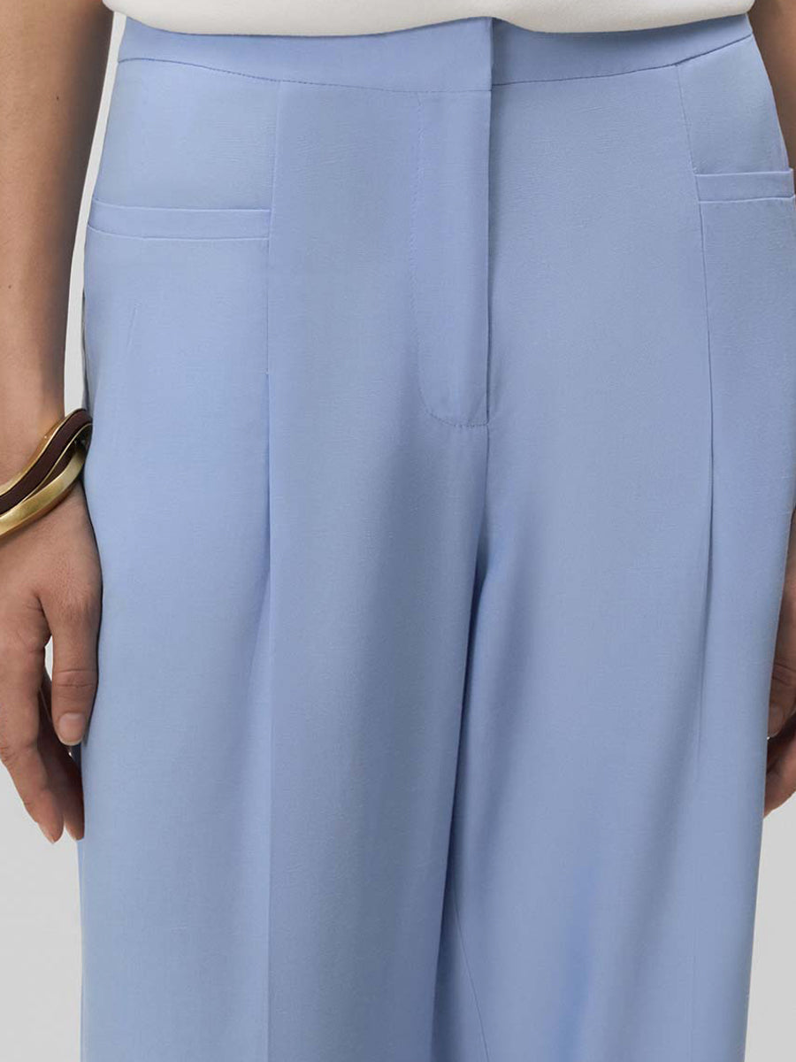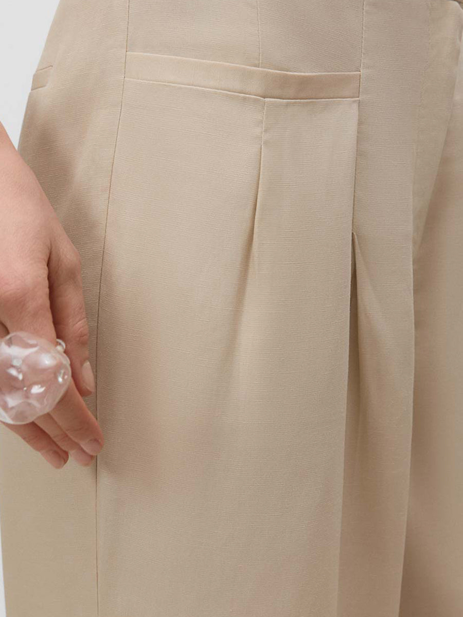 Pantalón largo de pierna ancha con pinzas y bolsillos en delantero y espalda. Cierre mediante cremallera oculta, corchetes y botón