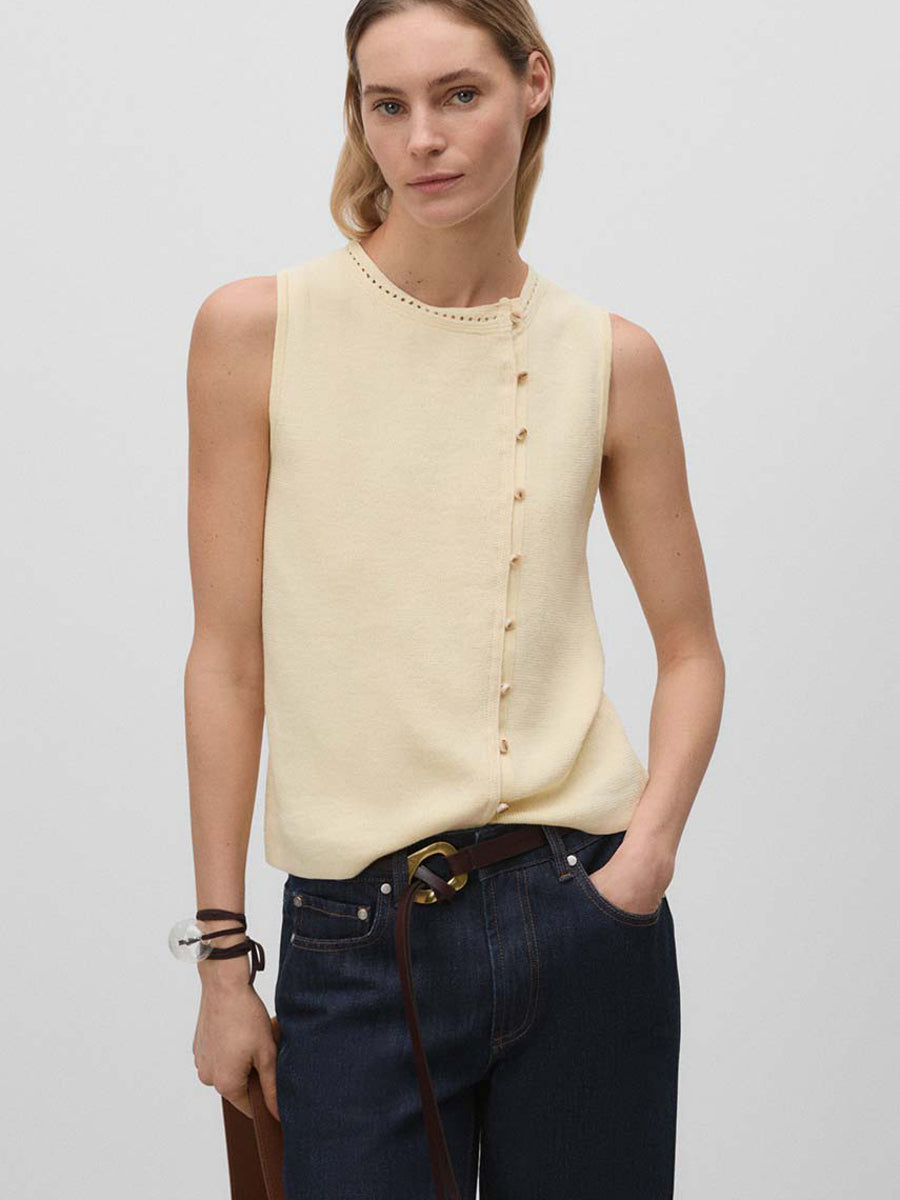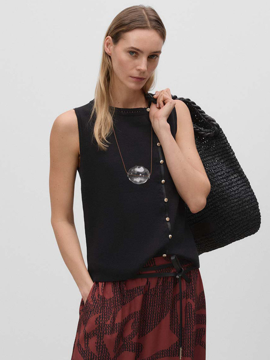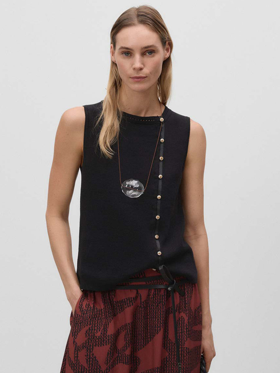 Top de punto sisado con escote caja. Cierre mediante botonadura frontal asimétrica.