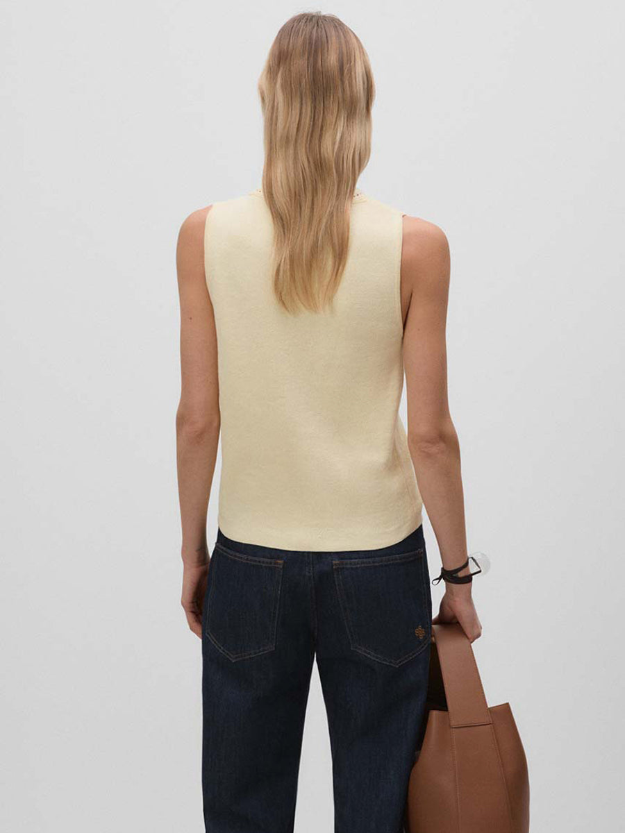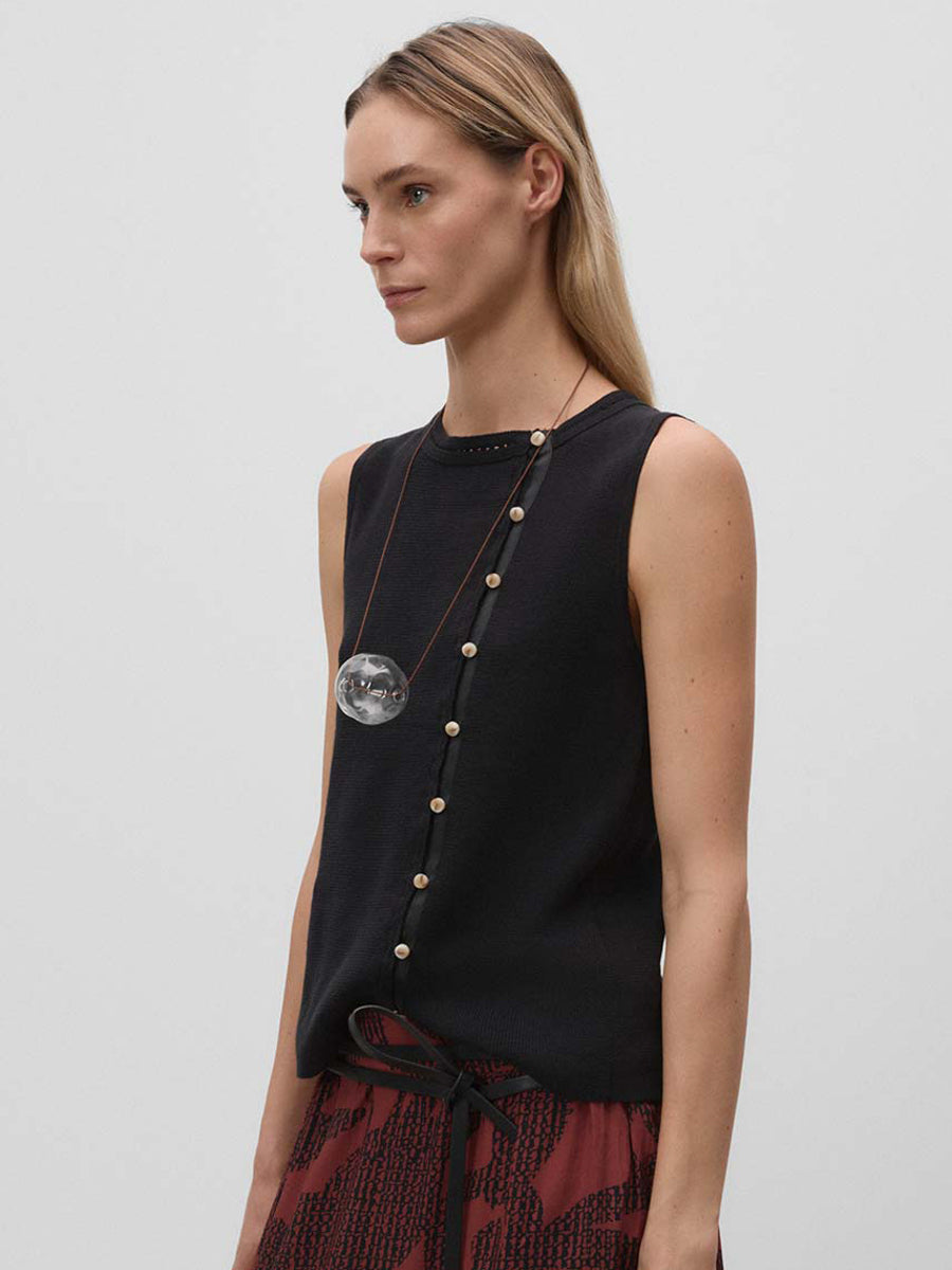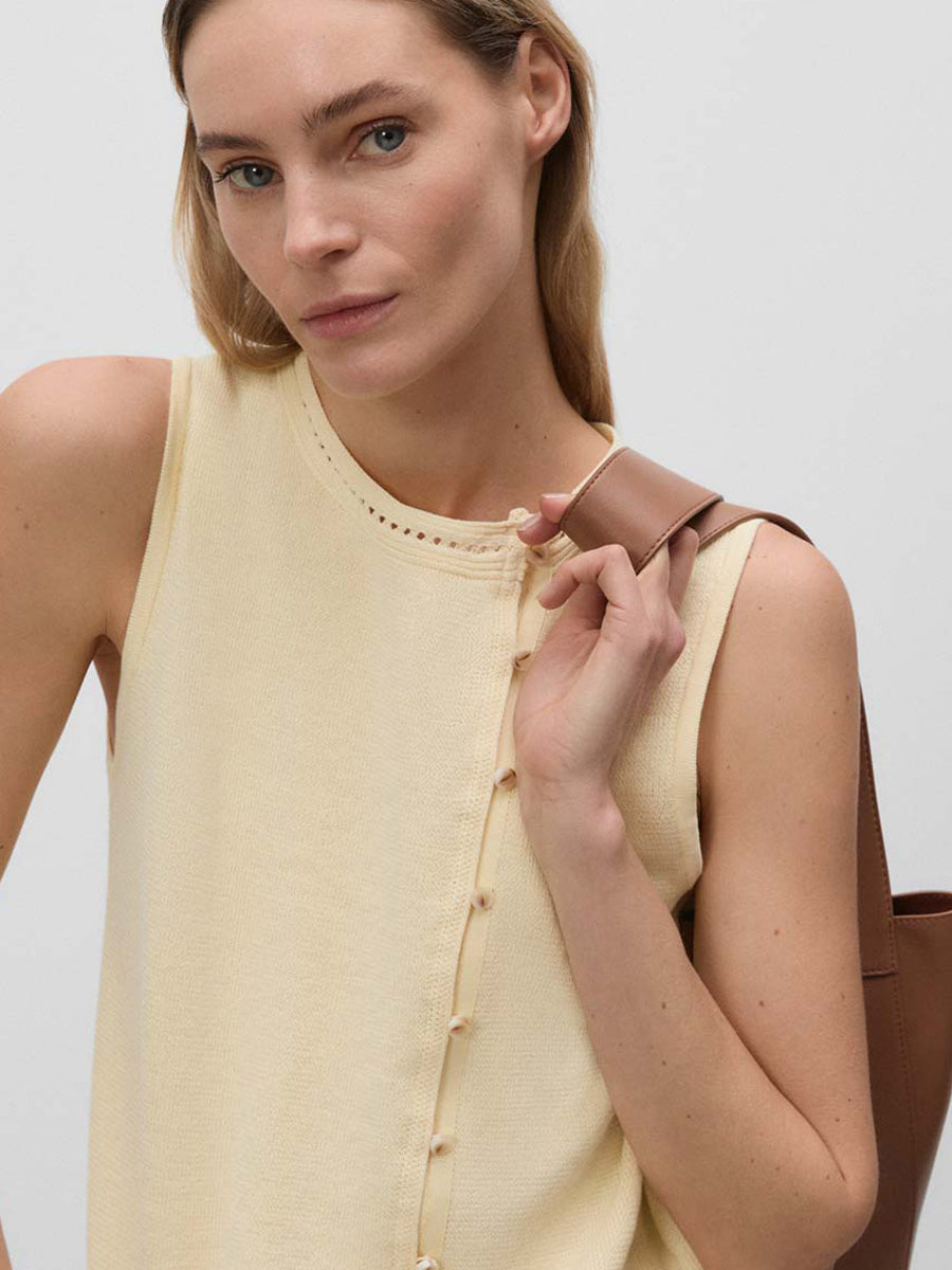 Top de punto sisado con escote caja. Cierre mediante botonadura frontal asimétrica.