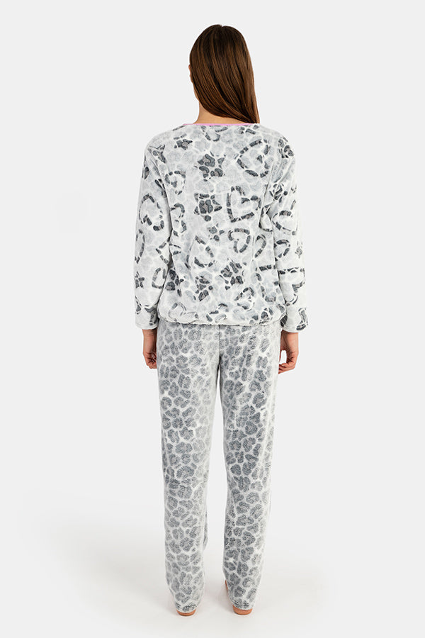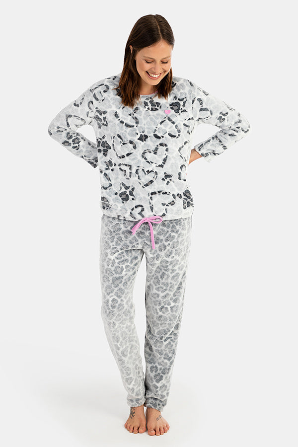 Pijama de mujer, compuesta por camiseta en polar estampado, manga larga cuello con vivo en contraste y tira ajustable en cintura. Pantalón largo en polar estampado y goma en cintura