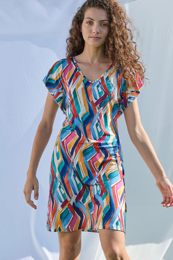 Vestido de mujer en tejido de punto de viscosa estampado, la mangas cortas son amplias pero el interior de la manga ceñido a la sisa para mas comodidad y el cuello en forma de pico bajo, acabado con ribete.