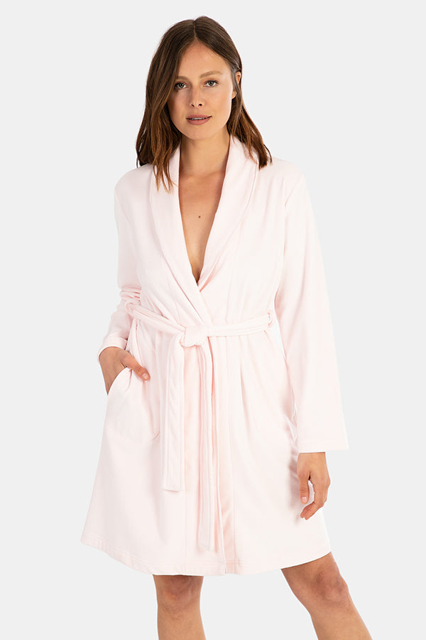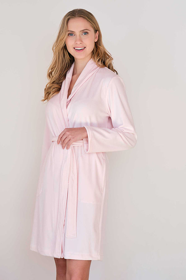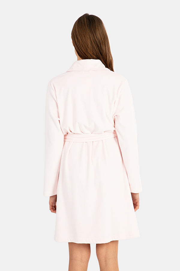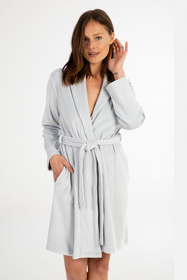 Bata de mujer larga cruzada en tejido polar muy suave, en color gris. Con cuello smoking y dos bolsillos laterales. Micropolar