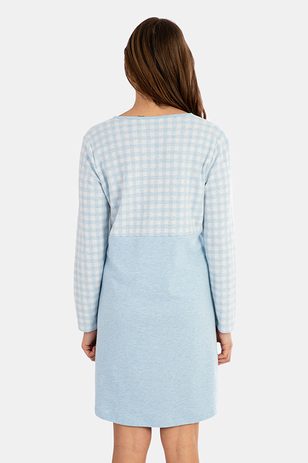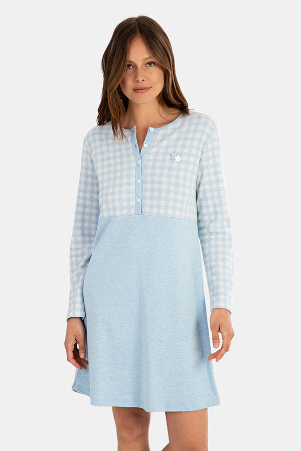 Camisón de manga larga en tejido fantasía de cuadros Vichy combinado con la parte de abajo del mismo tejido pero en liso. Cuello y tapeta en tejido liso. Botones en blanco. Tiene un detalle de dos apliques de estrellas cosidas.
