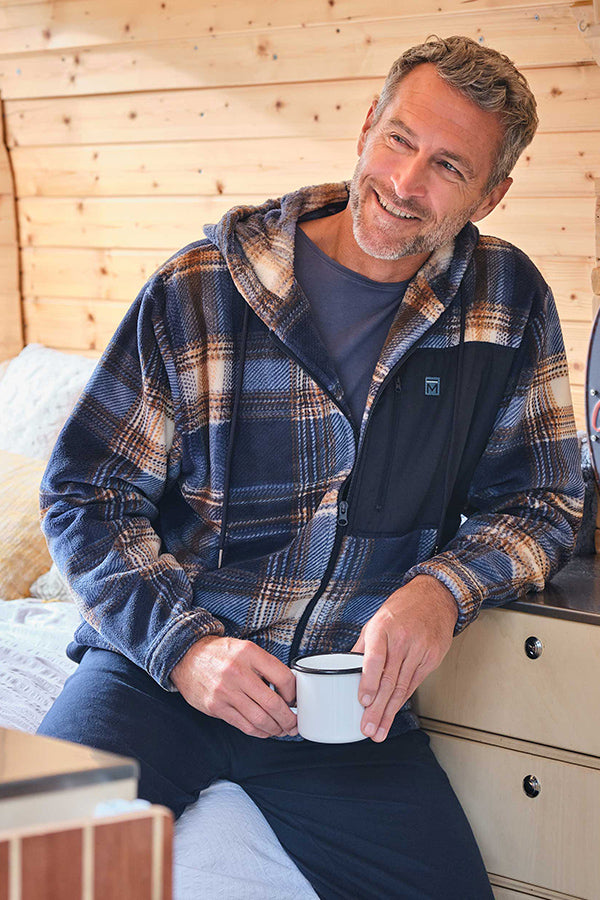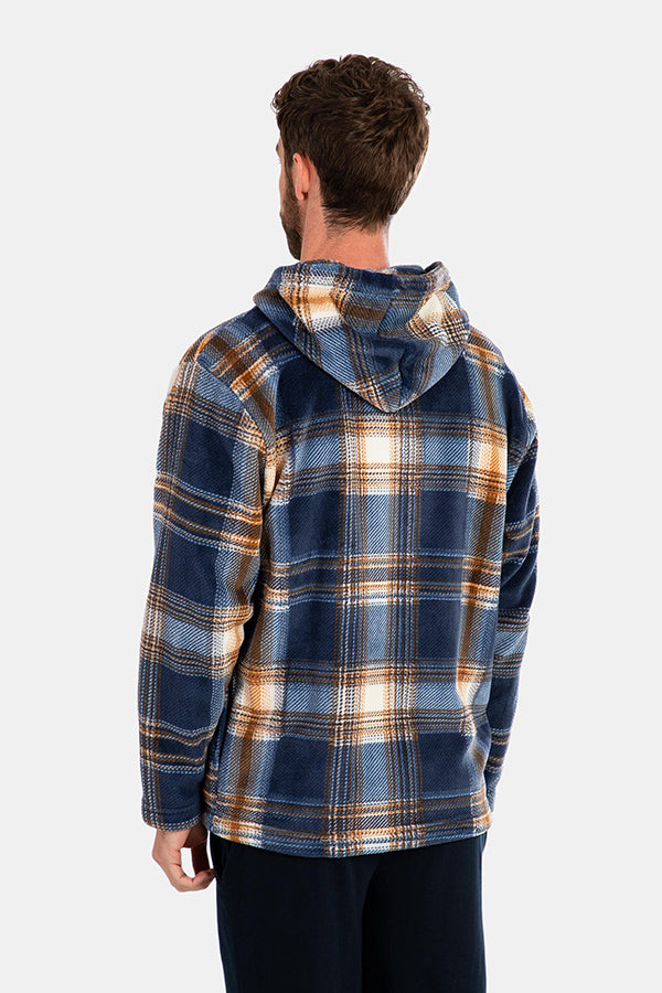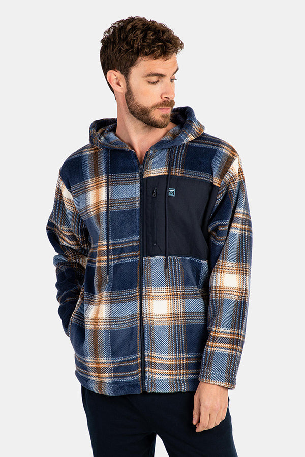 Chaqueta corta en tejido tipo polar con estampado cuadros, capucha y bolsillo con cremallera en el pecho de color azul. Cremallera de nylon central, incluye dos bolsillos laterales, de aspecto suave y agradable al tacto.