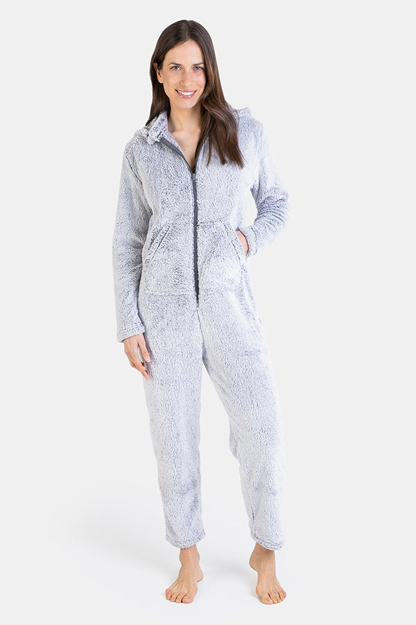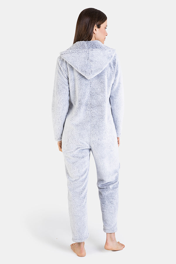 Pijama de mujer tipo mono de una sola pieza, en tejido polar y con cierre de cremallera. Tiene capucha y dos bolsillos tipo canguro en los laterales.