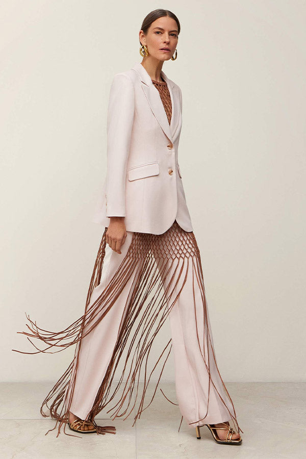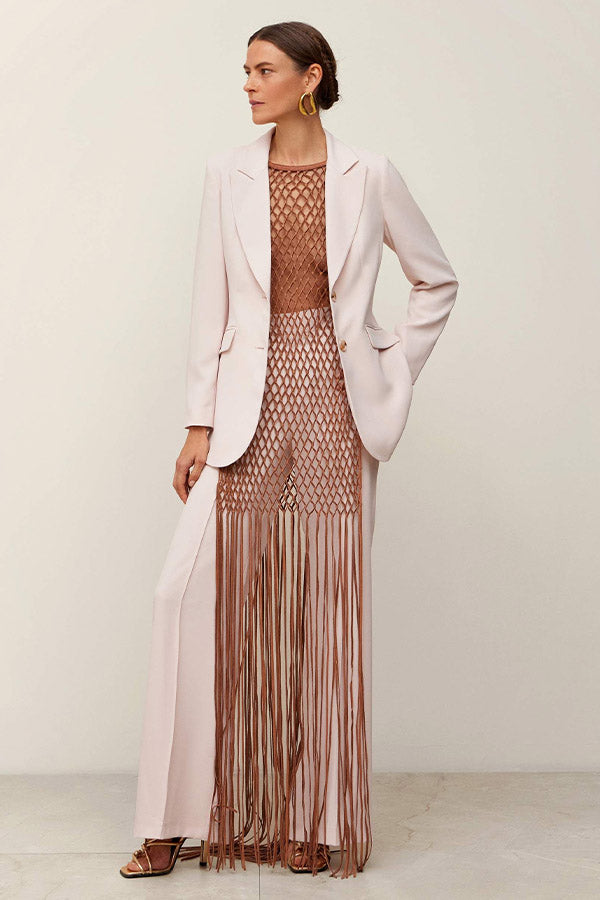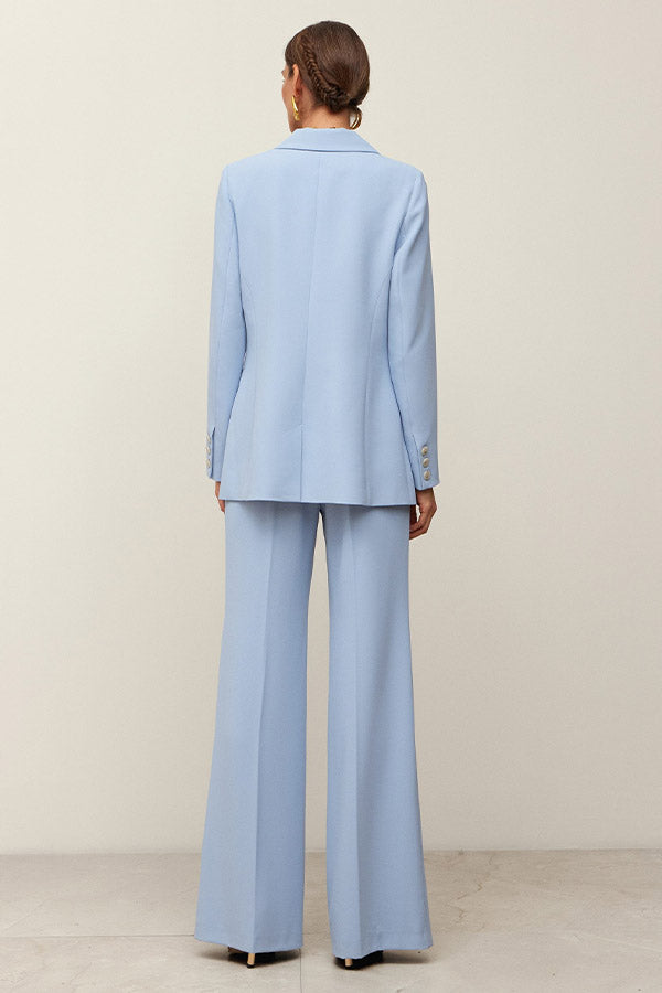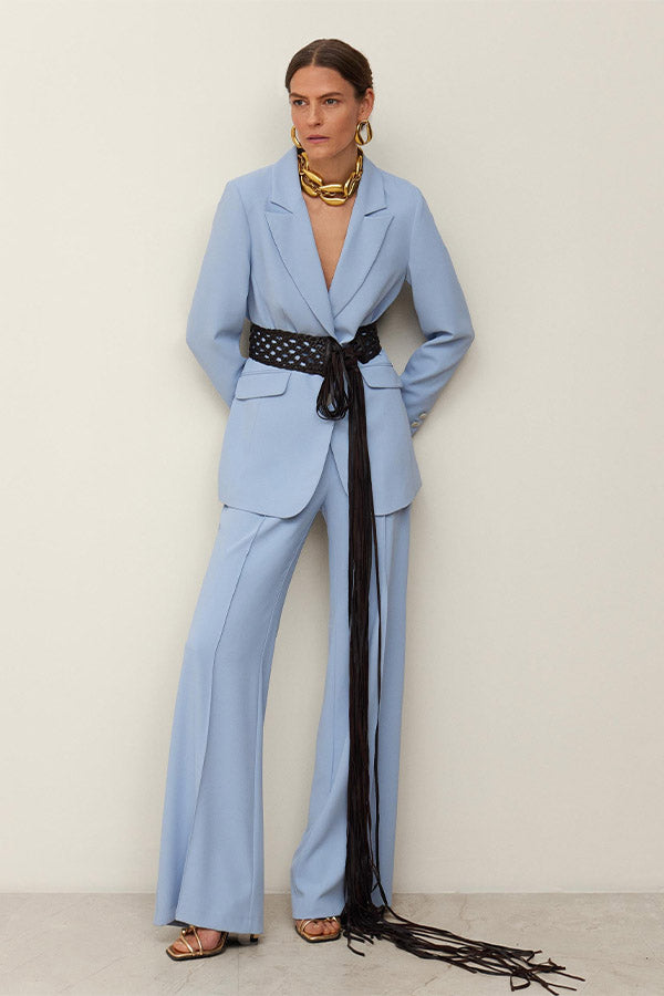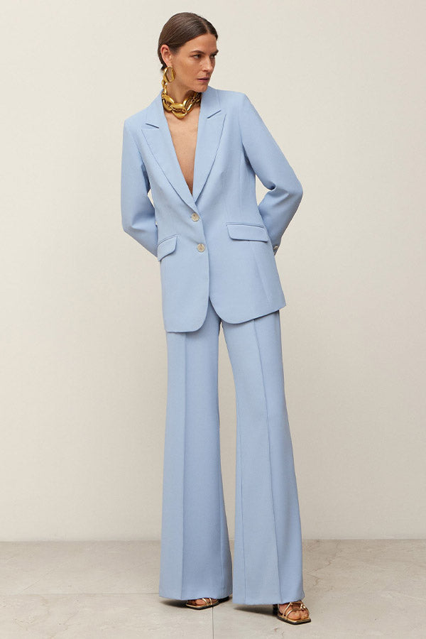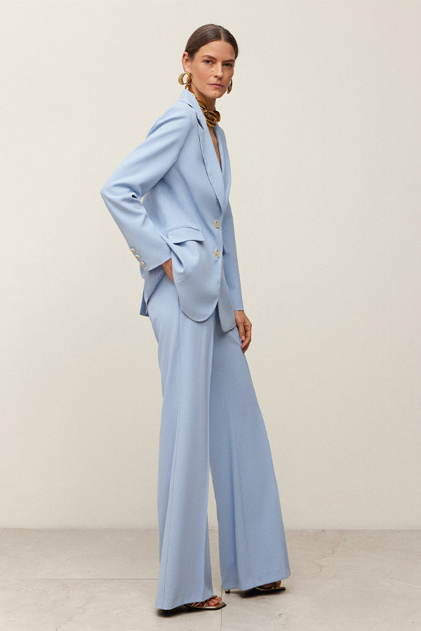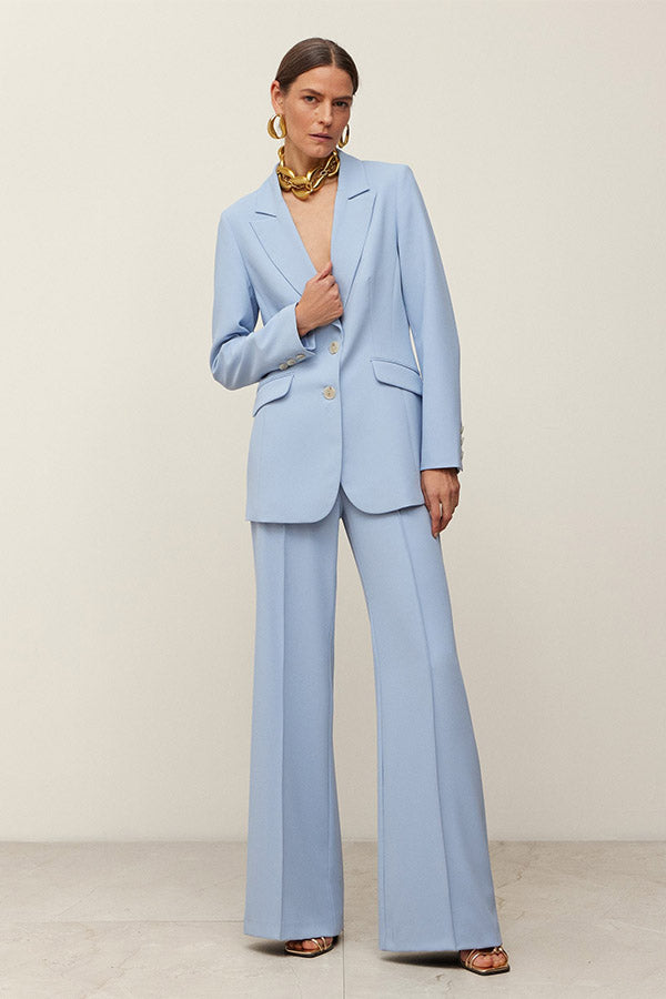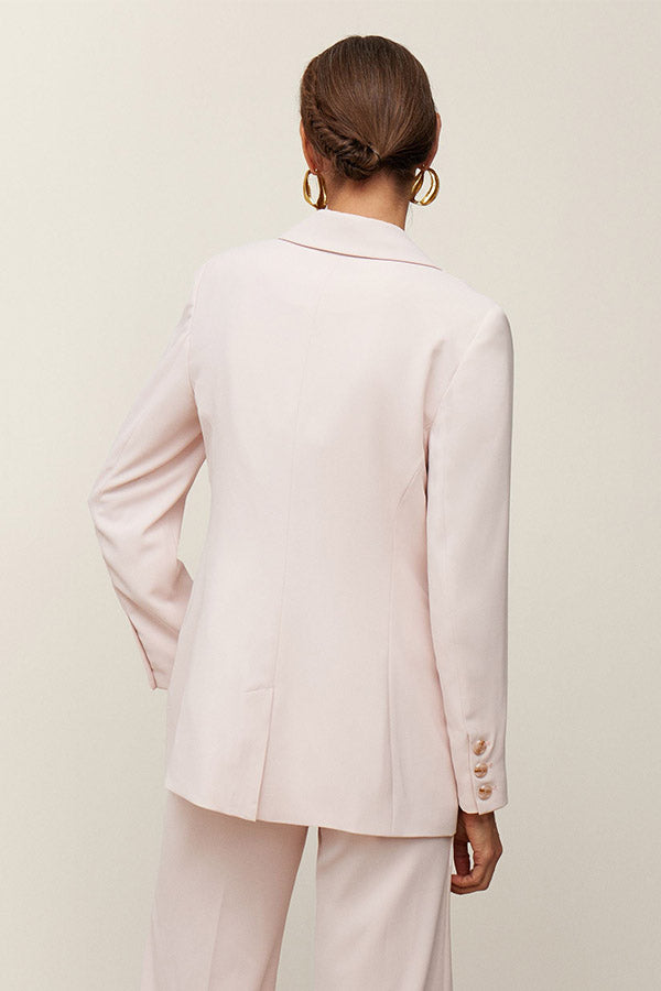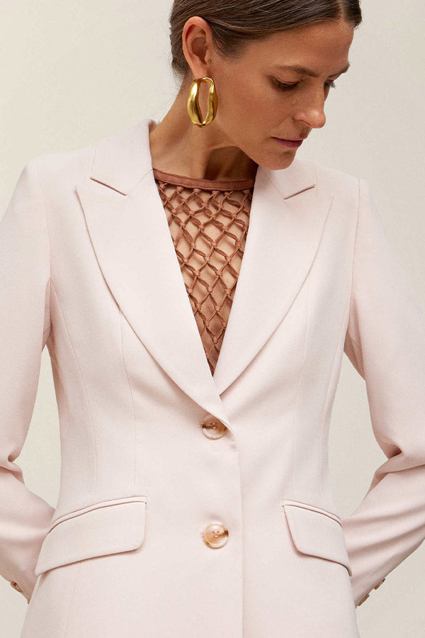 Chaqueta entallada de crepe con cuello solapa en pico y cierre delantero mediante dos botones. Bolsillos con cartera. Forro al tono.