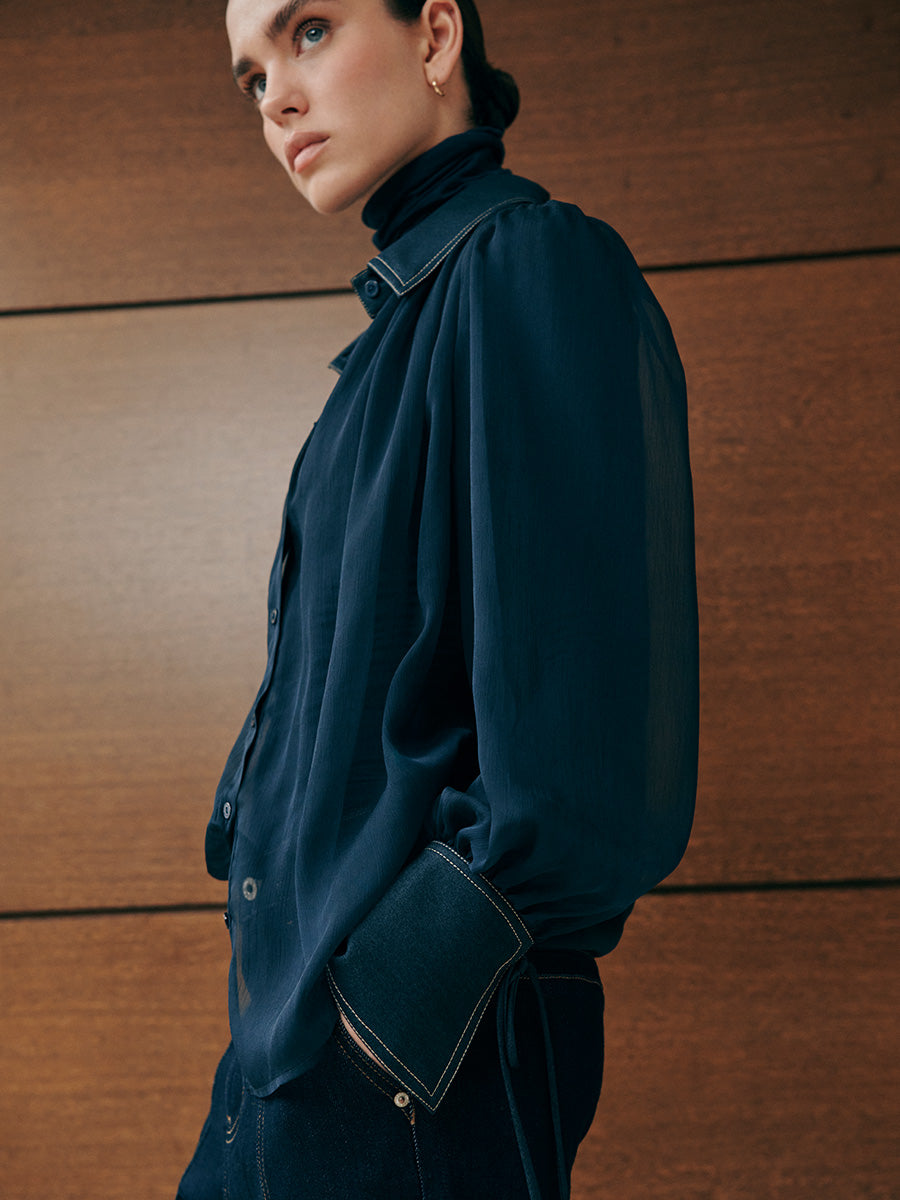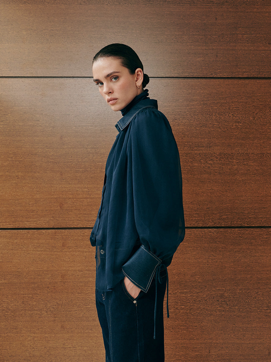 Blusa de gasa con cuello camisero. Delantero fruncido en cuello. Cierre mediante botonadura frontal. Manga ligeramente abullonada con puños con lazada. Cuello y puños con pespuntes y tejido a contraste. Presillas de corchete en hombro para unir camiseta de tirantes interior a tono.