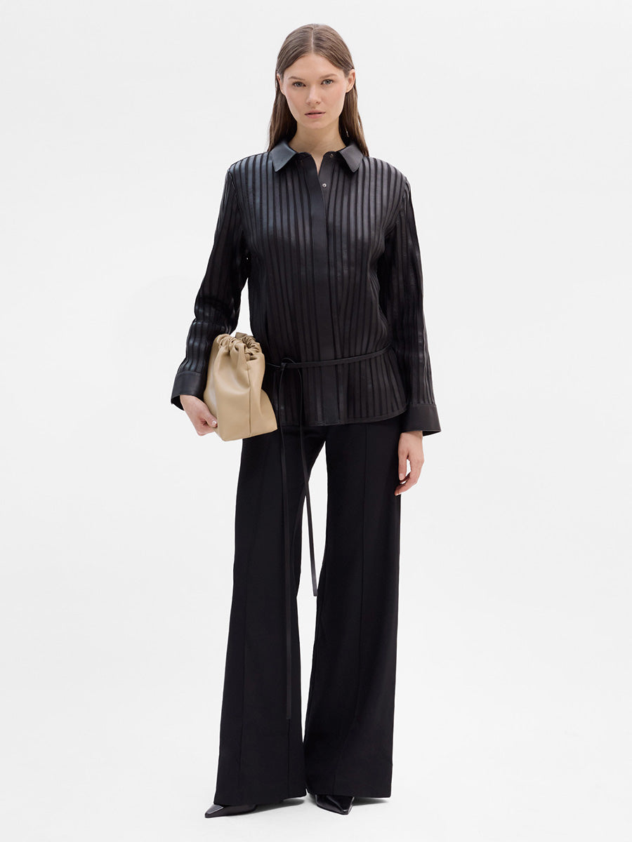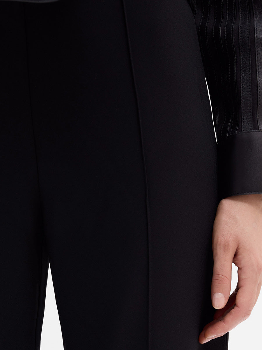 Pantalón de tiro alto con lorza central en el delantero. Silueta ligeramente acampanada. Cinturilla estructurada y cierre mediante cremallera invisible en el lateral. Diseño sin bolsillos.