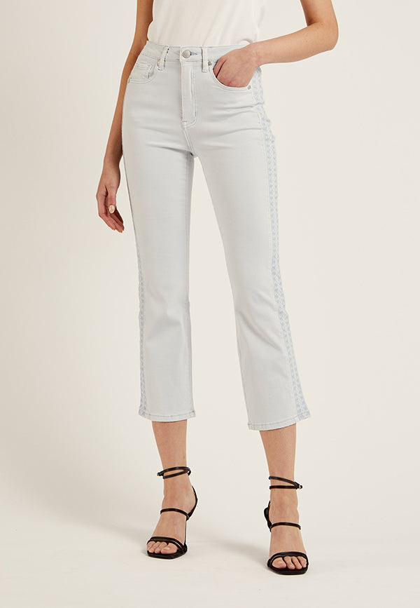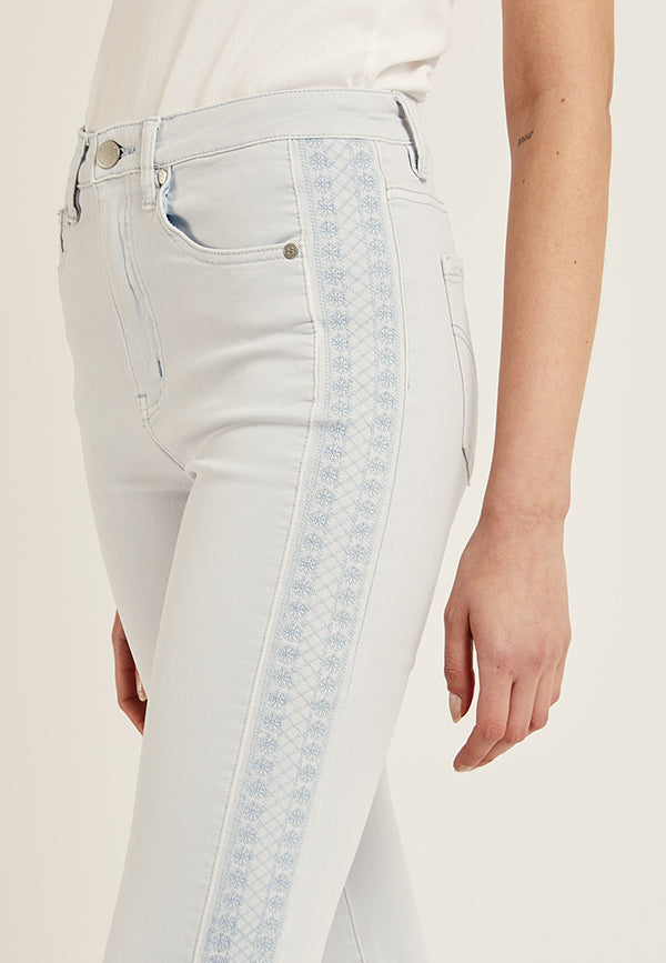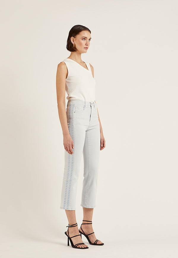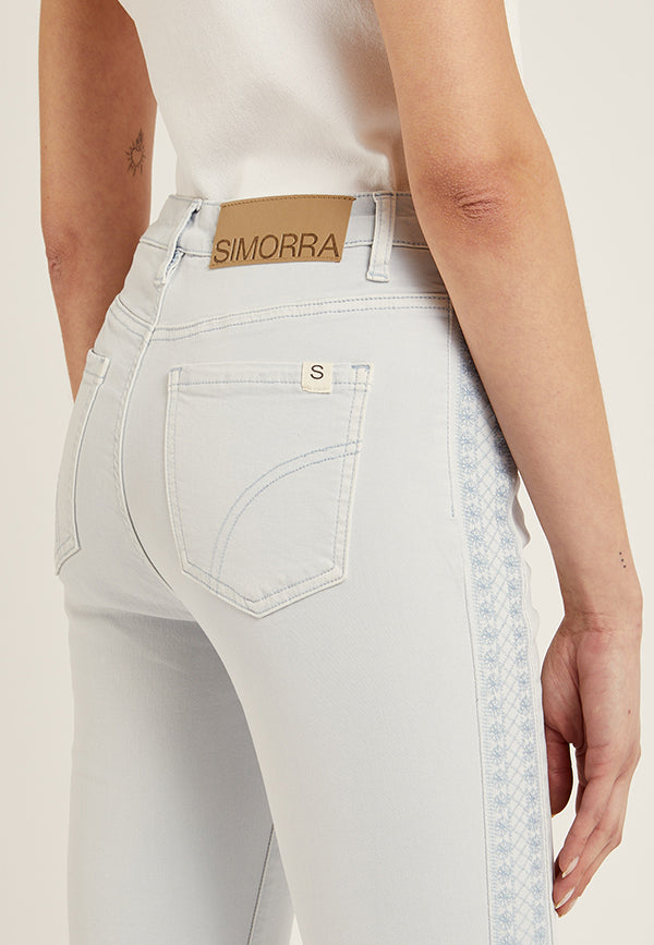 Pantalón recto en algodón y cinco bolsillos. Bordado decorativo al tono en los laterales. Cierre mediante cremallera oculta por tapetay botón.