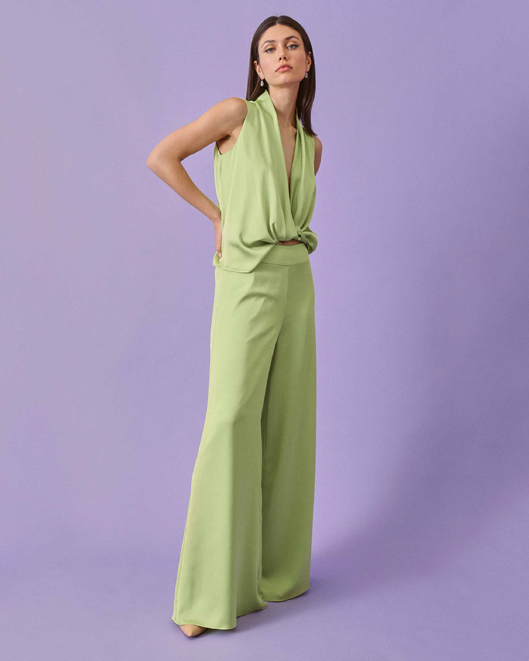 Pantalón fluido en tejido satinado con ancho palazzo, cinturilla ancha, y cierre lateral con cremallera invisible.