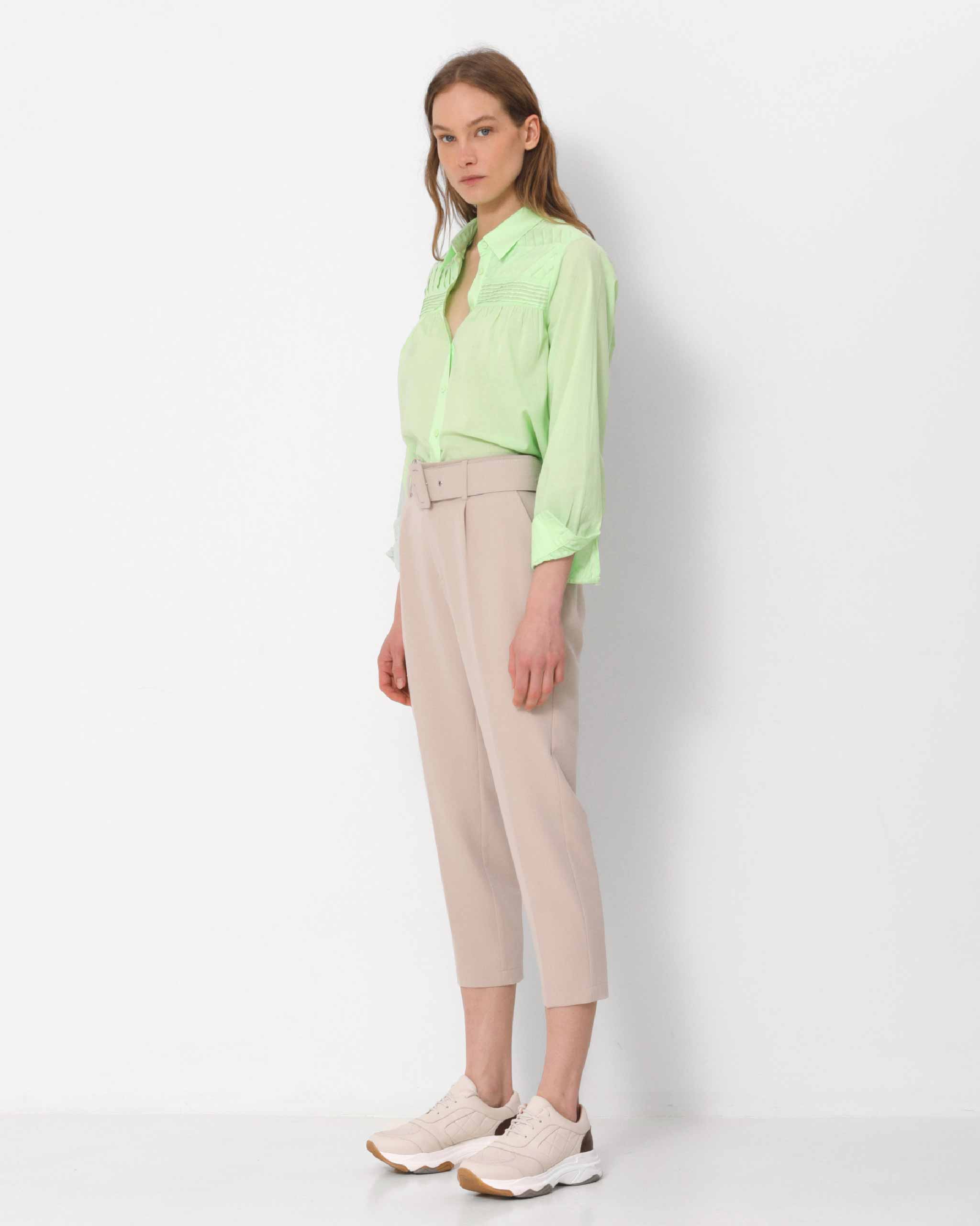 Pantalón con pinzas recto de tiro alto. Cinturón forrado al tono incorporado. Bolsillos en el delantero y de vivo en la espalda. Cierre mediante cremallera y corchete oculto por tapeta.