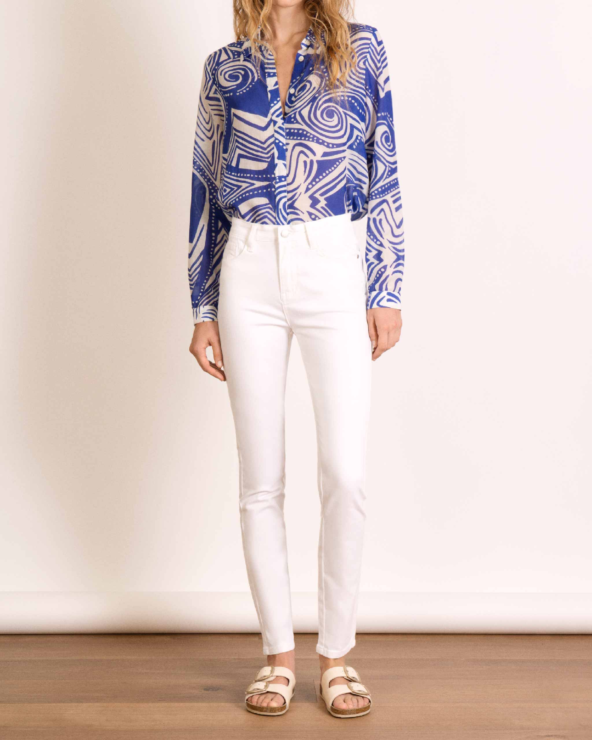 Pantalón denim skinny con bolsillo laterales y traseros. Cierre mediante cremallera oculta por tapeta y botón. Trabillas para el cinturón.